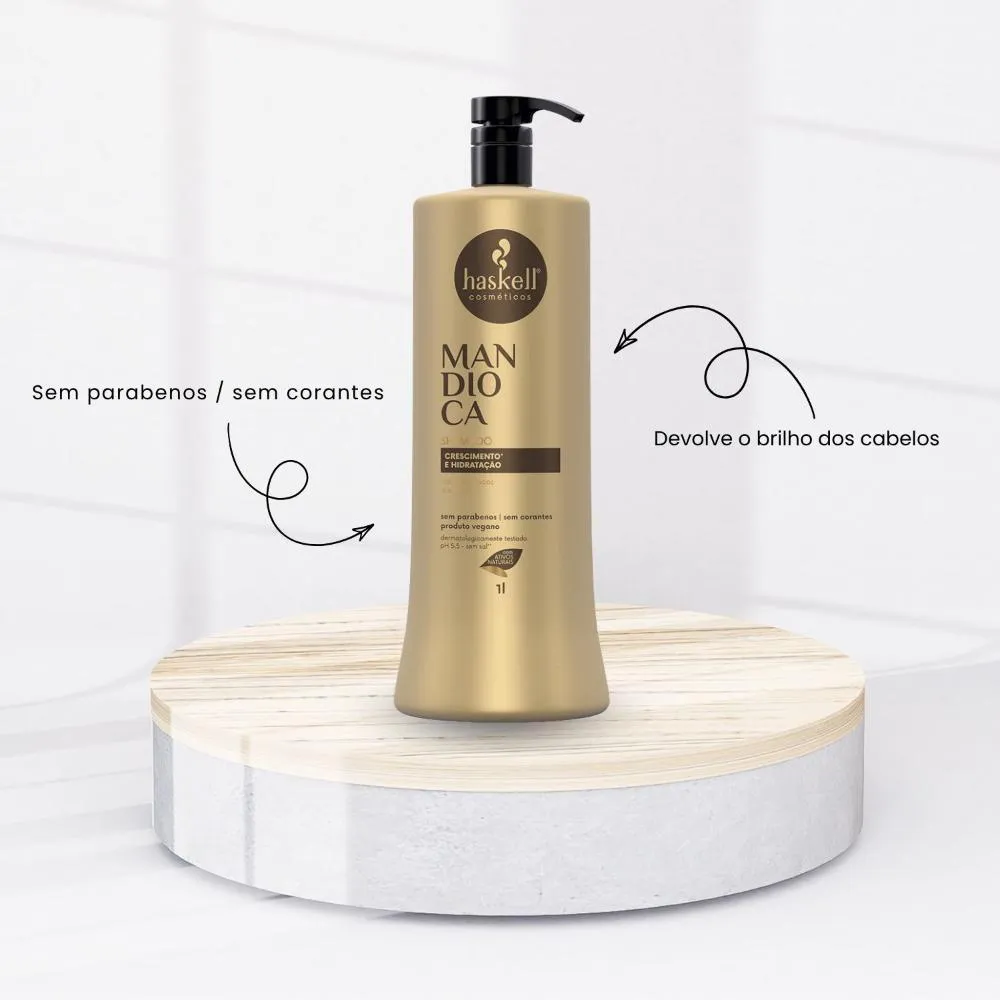 O Shampoo Haskell Mandioca foi desenvolvido para promover crescimento saudável, força e vitalidade aos fios. Sua fórmula rica em extrato de mandioca oferece nutrição intensa desde a raiz, enquanto ajuda no fortalecimento da fibra capilar e na recuperação de cabelos frágeis e quebradiços. Limpa profundamente sem ressecar, preparando o cabelo para uma rotina de crescimento e resistência.Para Qual tipo de cabelo é Indicado?