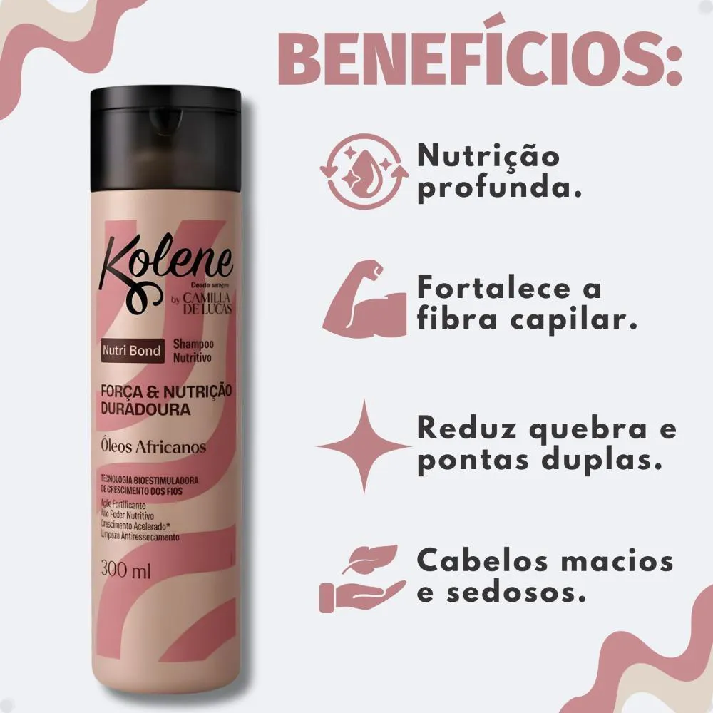Descubra o Shampoo Kolene By Camilla De Lucas Nutri Bond 300ml, uma inovação da marca Kolene para o cuidado capilar. Este shampoo foi desenvolvido para oferecer uma experiência de nutrição e fortalecimento, visando a saúde e a vitalidade dos seus cabelos. Ideal para quem busca um tratamento eficaz para os fios, o Shampoo Nutritivo Kolene By Camilla De Lucas Nutri Bond é a escolha perfeita para integrar sua rotina de beleza.Benefícios Principais