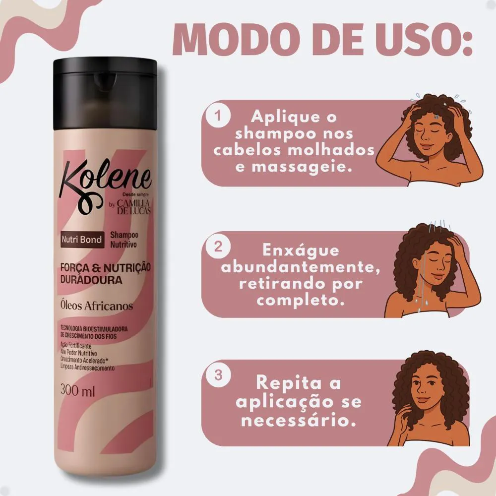 O Shampoo Kolene By Camilla De Lucas Nutri Bond 300ml é ideal para uso diário ou conforme a necessidade de cuidado e nutrição dos seus cabelos, integrando-se perfeitamente à sua rotina de higiene capilar.Modo de Uso/Aplicação