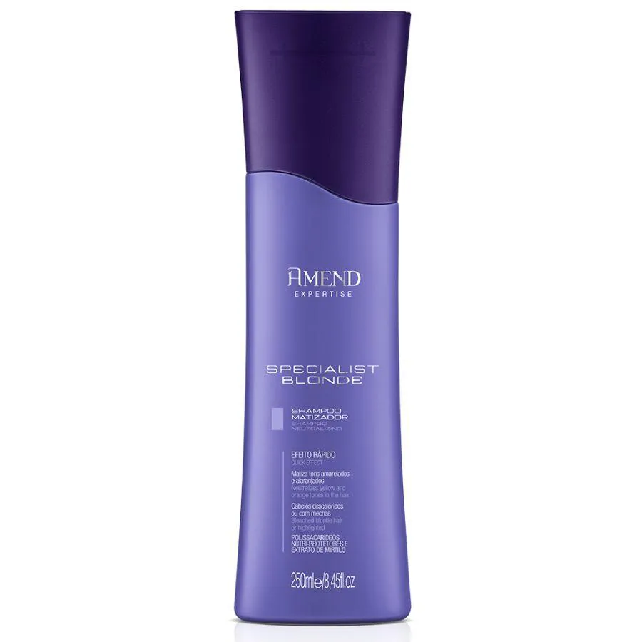 shampoo Matizador Amend Expertise Specialist Blonde fórmula intensificada com antirradicais livres, antioxidantes, vitaminas e pigmentos concentrados de excelente afinidade com os fios. Com imediato efeito matizador, neutraliza os indesejáveis tons amarelados ou alaranjados. Promove reconstrução do fio danificado pela descoloração, atuando como agente fortalecedor.