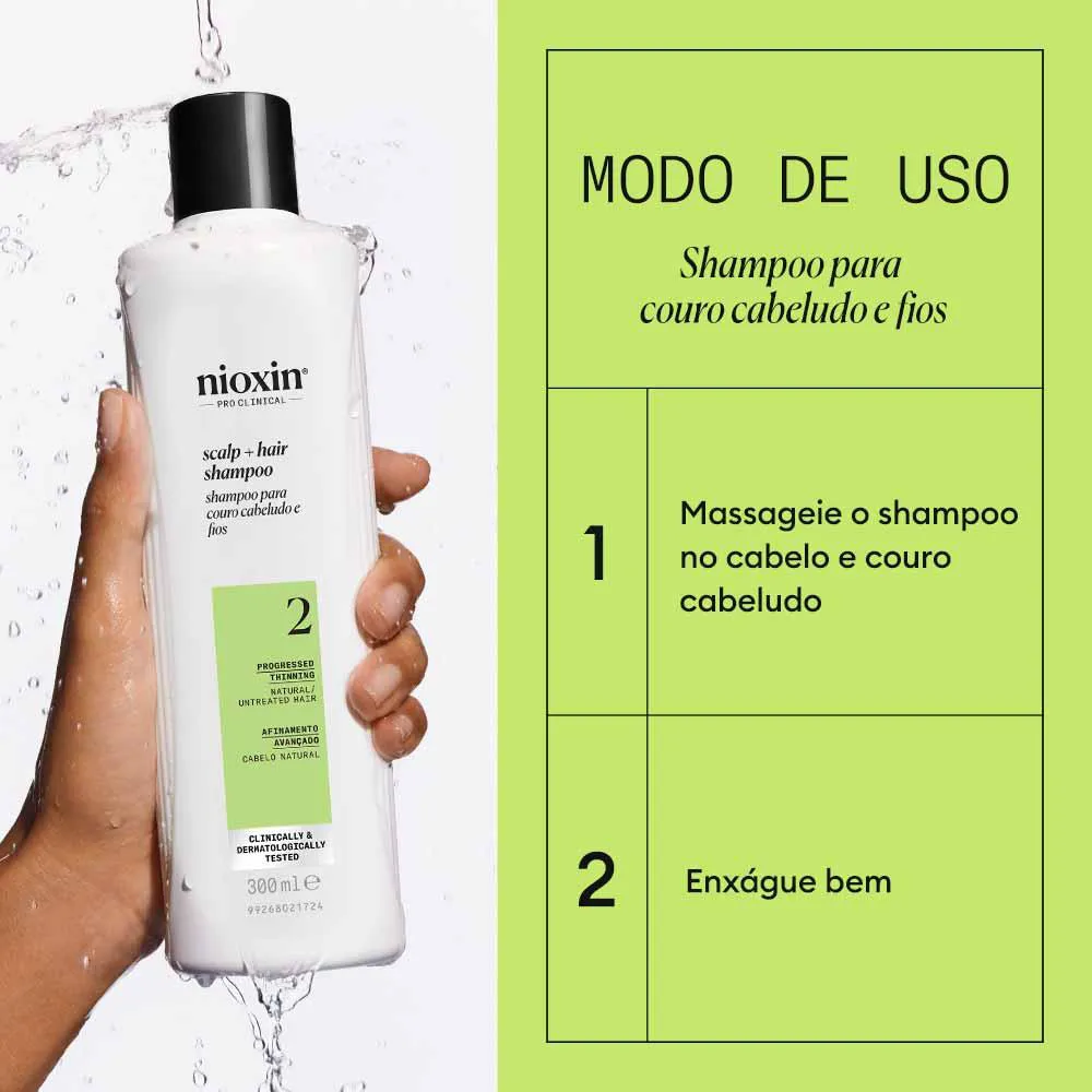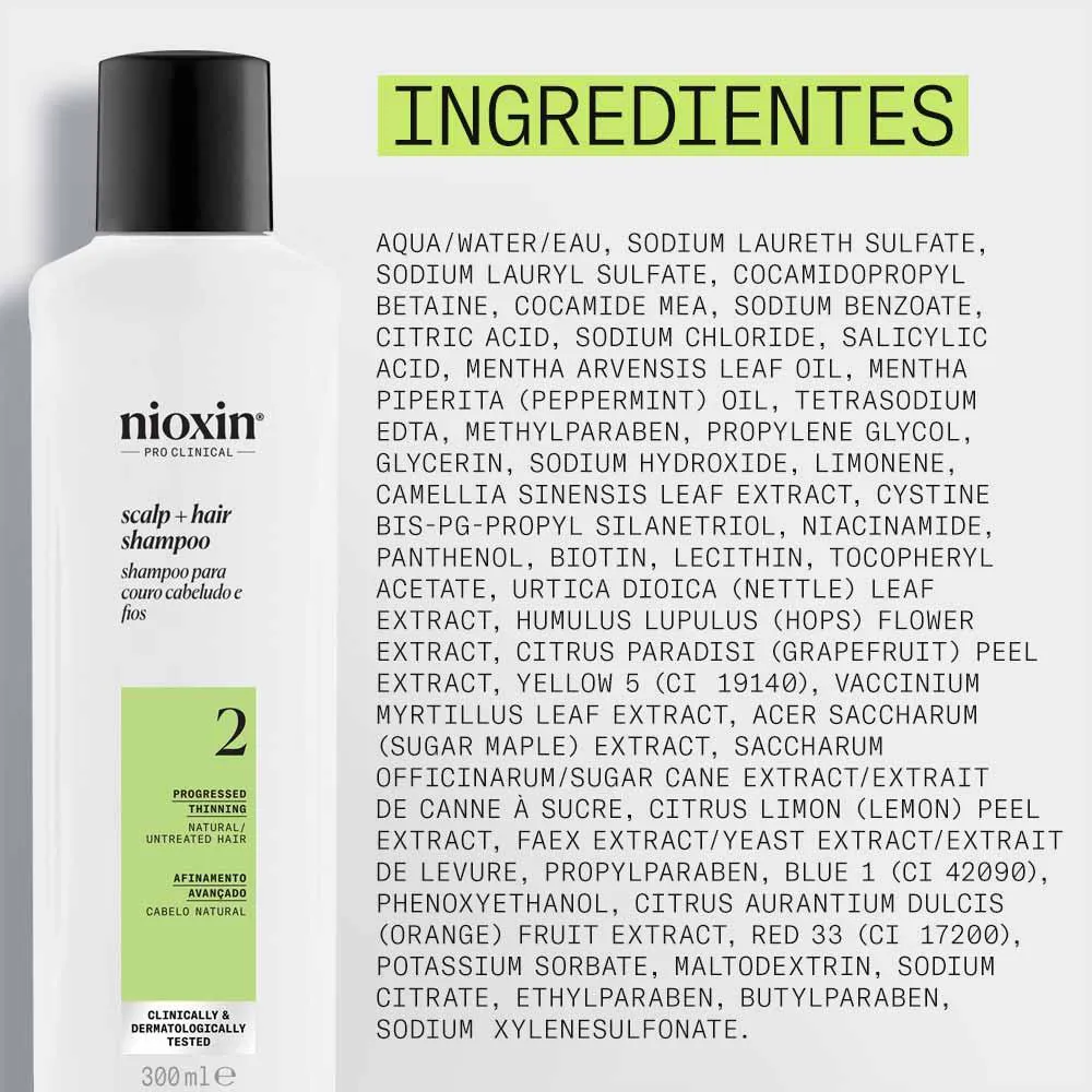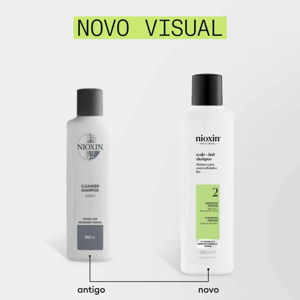 O Shampoo Nioxin System 2 é um revolucionário shampoo desenvolvido especialmente para combater o afinamento dos cabelos. Este produto é uma parte essencial do renomado sistema Nioxin, que visa aumentar a densidade capilar em cabelos que sofrem de afinamento avançado. O Nioxin System 2 Shampoo é formulado para proporcionar limpeza profunda, removendo resíduos e DHT (dihidrotestosterona), que é conhecido por contribuir para o afinamento capilar. Além disso, prepara o couro cabeludo, criando um ambiente saudável para o crescimento de fios mais fortes e volumosos.