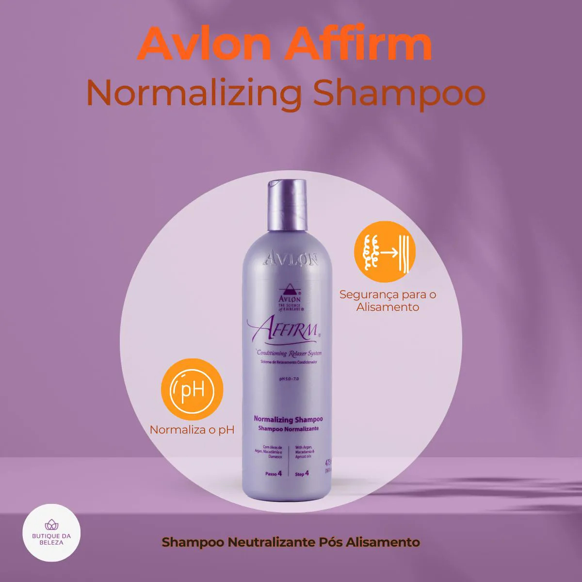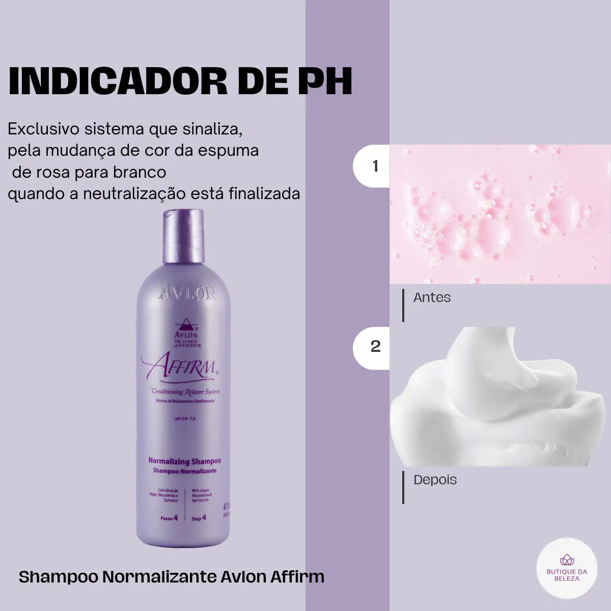 SERVIR E AJUDAR SÃO NOSSOS DEVERES shampoo NORMALIZANTE AVLON AFFIRM Se seus cabelos estão fragilizados após procedimentos químicos, o Shampoo Normalizante Avlon Affirm é o cuidado essencial para restaurar o equilíbrio natural dos fios. Desenvolvido com pH entre 5.0-7.0, ele remove resíduos alcalinos e minerais, neutralizando químicas agressivas enquanto fortalece e hidrata profundamente. Sua fórmula avançada, com exclusivo indicador de resíduos, faz com que a espuma do shampoo se torne rosa, indicando resquícios de química presentes nos fios, e branca, quando toda a química residual já foi retirada. Avlon Affirm Normalizing Shampoo promove cabelos mais resistentes e saudáveis após processos químicos de relaxamentos e alisamentos. INDICADO PARA QUAL TIPO DE cabelo Perfeito para cabelos quimicamente tratados, relaxados ou alisados que necessitam de recuperação e manutenção do pH natural. BENEFÍCIOS Normalização do pH: Neutraliza resíduos químicos, reequilibrando o couro cabeludo e os fios. Fortalecimento e Brilho: Melhora a resistência e o brilho natural dos cabelos. Hidratação Profunda: Mantém a umidade essencial, prevenindo o ressecamento. Proteção Pós-Química: Garante fios saudáveis e revitalizados após tratamentos agressivos. RESULTADOS Cabelos mais fortes, saudáveis e hidratados, com pH equilibrado e brilho intenso. MODO DE USO Aplique nos cabelos molhados, massageando suavemente até formar espuma. Deixe agir por alguns minutos e enxágue bem. Repita, se necessário. DICA: Use como parte do sistema de manutenção da linha Affirm para máxima proteção e recuperação pós-química.