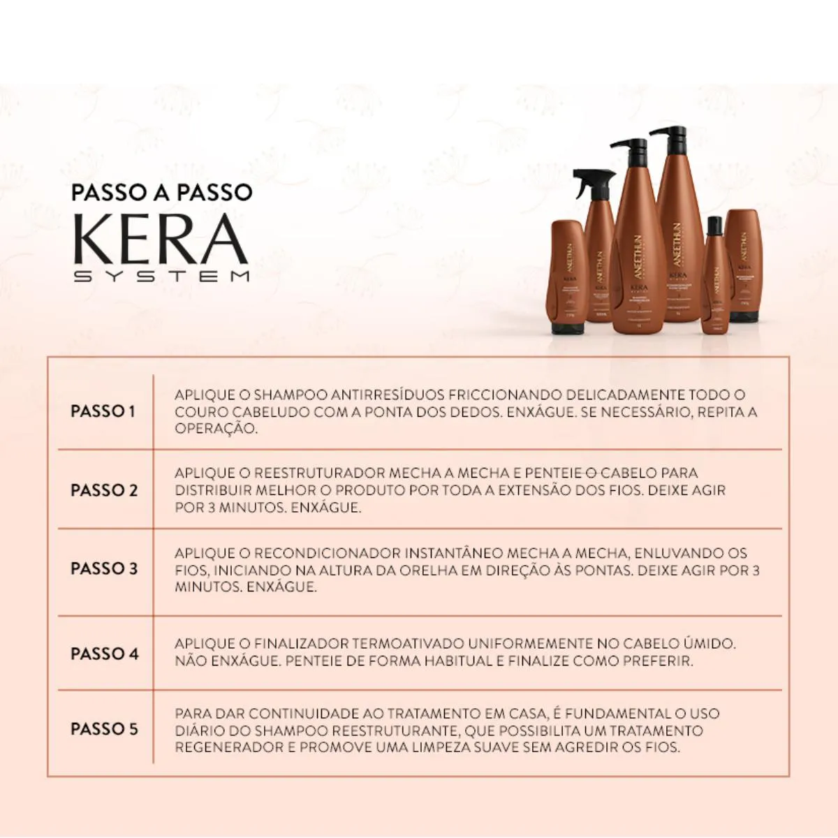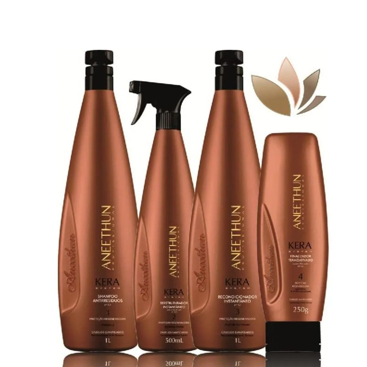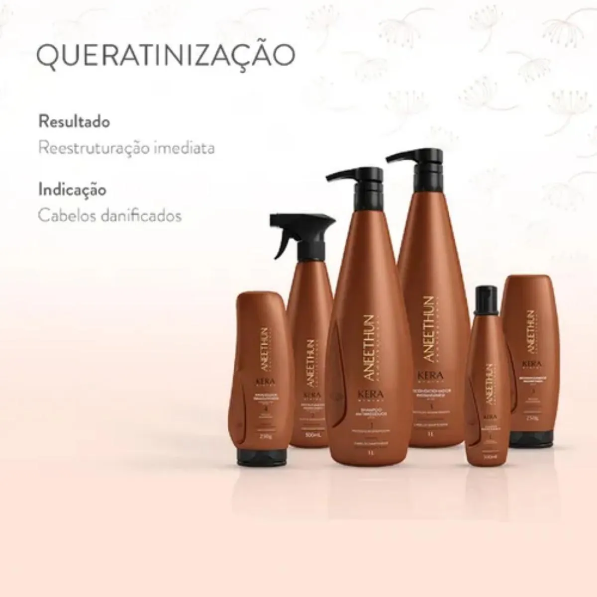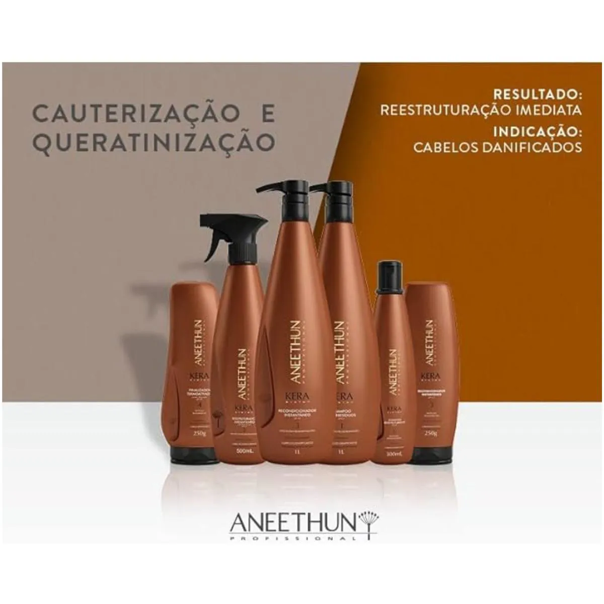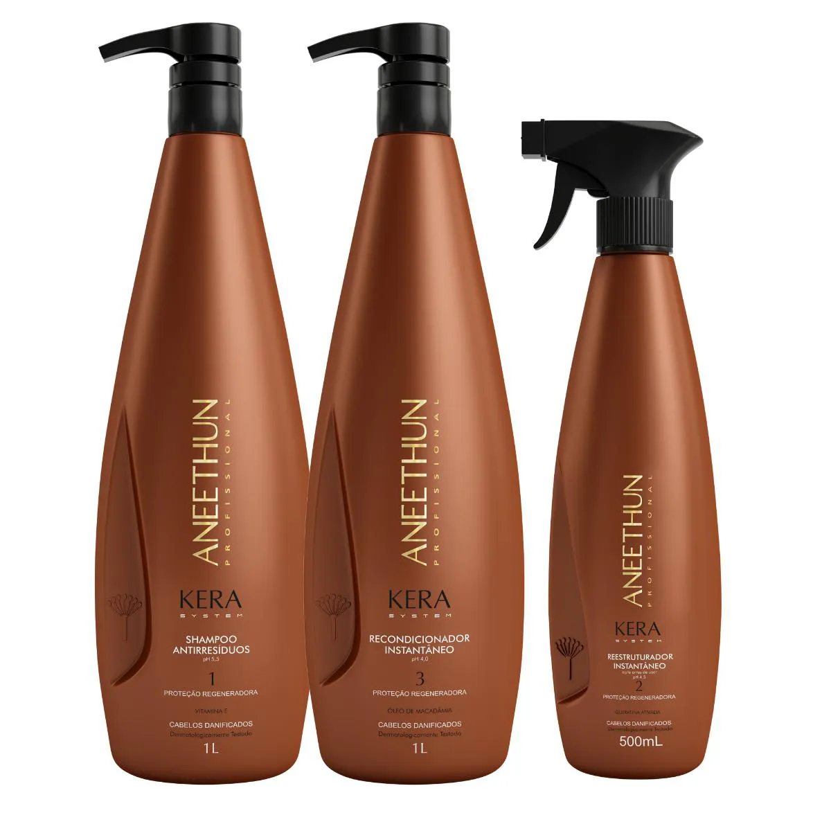 Shampoo Reestruturante Aneethun Kera System – Proteção Regeneradora 1000 ml Formulado para fazer uma limpeza profunda e eficiente sem agredir a estrutura do couro cabeludo e dos fios. Com ativos especiais como vitamina e, Queratina e Óleo de Macadâmia, que juntos vão reestruturar toda a fibra capilar, fornecendo fios brilhantes, macios e recuperados. máscara Condicionante é um tratamento 2 em 1 que funciona como máscara reparadora e condicionador ao mesmo tempo. Ajuda na finalização do tratamento de reestruturação, hidrata e proporciona fios mais macios. É recomendado para cabelos danificados, que passaram ou não pelo processo de cauterização dos fios. Aneethun Kera Máscara Condicionante possui em sua fórmula a Queratina hidrolisada, Óleo de macadâmia e vitamina E que fecha as cutículas, condiciona, recupera os danos, ajuda na reparação, hidrata instantaneamente, e deixa os cabelos mais macios e sedosos.Pode ser utilizado como máscara para o tratamento quinzenal ou como condicionador para a hidratação diária. Diferencias da linha: - Dois serviços: Cauterização e Queratinização- Queratina hidrolisada ativada- Resultado imediato no lavatório- Proteção termoativada Reestruturador Instantâneo Kera System é a solução perfeita para cabelos danificados, quebradiços e sem brilho. Com sua fórmula exclusiva, o produto proporciona proteção e restauração intensa aos fios, deixando-os saudáveis e revitalizados. É um produto de cuidados capilares que oferece uma reestruturação instantânea aos fios. Suas principais características incluem ação rápida, hidratação profunda, reparação dos danos e proteção contra agressões externas. Os benefícios desse produto incluem cabelos mais saudáveis, macios, brilhantes e protegidos. Composto por queratina hidrolisada, ativada na forma de aminoácidos, que penetra na fibra capilar, reestruturando os fios. A combinação de queratina com agentes catiônicos especiais promove um tratamento intensivo aos fios. Vantagens:- Restauração Profunda