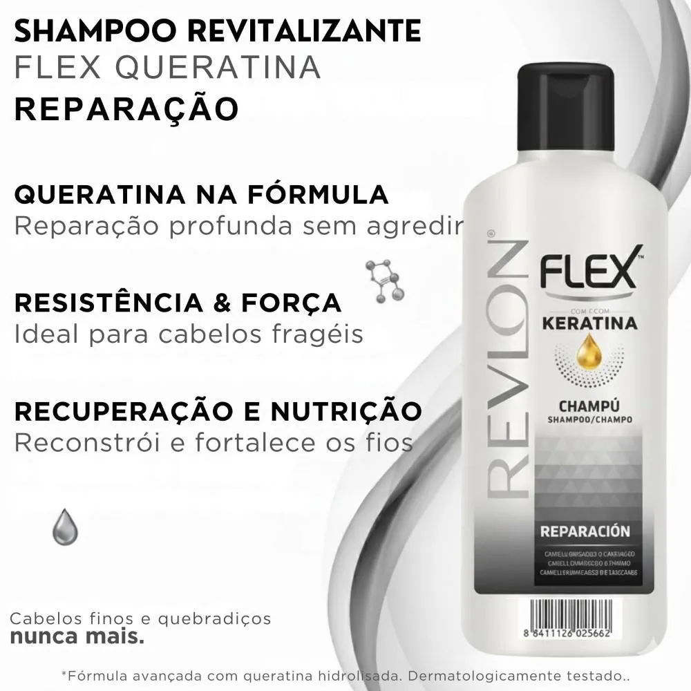 Aplique o shampoo sobre os cabelos molhados, massageando suavemente até formar espuma. Enxágue completamente e repita se necessário. Para um tratamento completo, utilize o condicionador Revlon Flex Queratina Reparação.Resultado:
