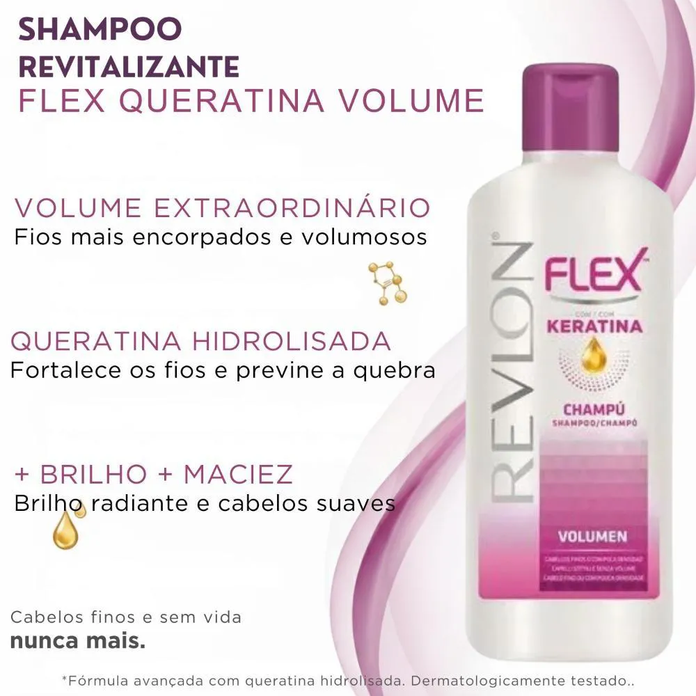 shampoo desenvolvido para limpar os fios com suavidade, restaurando o equilíbrio natural e proporcionando volume leve e movimento duradouro desde a primeira aplicação. Sua fórmula inovadora combina agentes de limpeza eficientes com nutrientes que fortalecem a fibra capilar, resultando em cabelos soltos, encorpados e com brilho natural.Indicado para cabelos finos e sem volume, o produto atua diretamente na raiz, melhorando a sustentação dos fios e devolvendo a vitalidade perdida. O uso contínuo ajuda a reduzir a quebra e o ressecamento, mantendo a aparência saudável e o toque macio.A tecnologia Flex da Revlon foi criada para oferecer força, leveza e flexibilidade, garantindo fios mais resistentes à quebra e com aparência naturalmente encorpada. Ideal para quem busca um cabelo com movimento, corpo e brilho radiante no dia a dia.Modo de uso: