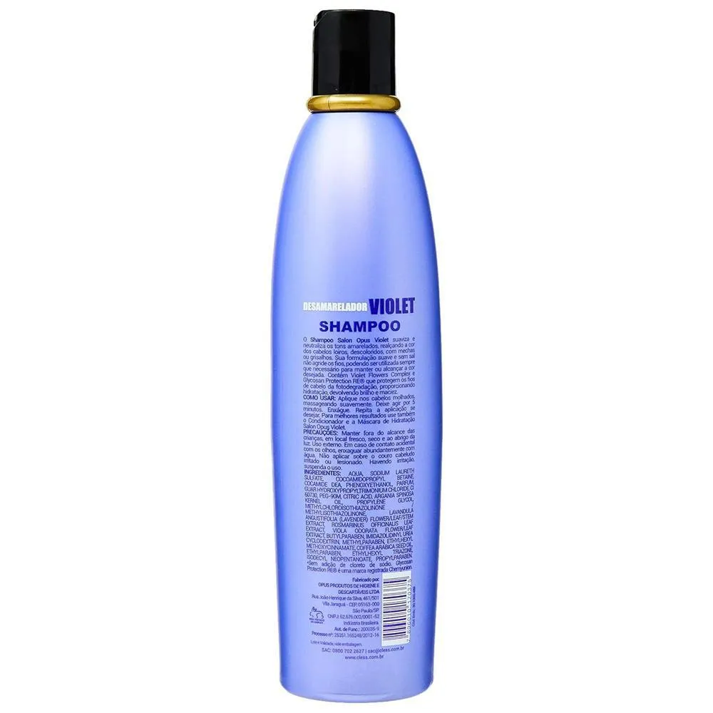 O shampoo Salon Opus Violet suaviza e neutraliza os tons amarelados,realçando a cor dos cabelos loiros, tingidos, descoloridos. com mechas ou grisalhos. Sua formulação suave e sem sal não agride os fios, podendo ser utilizada sempre que necessário, para manter ou alcançar a cor desejada. Contém Violet Flowers Complex e Glycosan Protection RE que protegem os fios de cabelo da fotodegradação, proporcionando hidratação, devolvendo brilho e maciez. O mesmo tratamento que você recebe nos salões, agora a seu alcance, em sua casa!