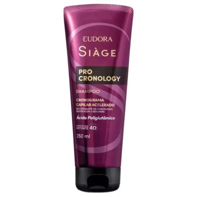 O Shampoo Siàge Pro Cronology é um produto capilar desenvolvido para recuperar danos nos cabelos, com uma fórmula enriquecida com Ácido Poliglutâmico. Serve para remover impurezas sem ressecar os fios, preparando-os para tratamento capilar, atuando nas 3 etapas do cronograma capilar: hidratação, nutrição e reconstrução. Sua fórmula é vegana, sem parabenos, petrolatos, sal ou corantes, e promete recuperar todos os tipos de danos capilares em 2 semanas.