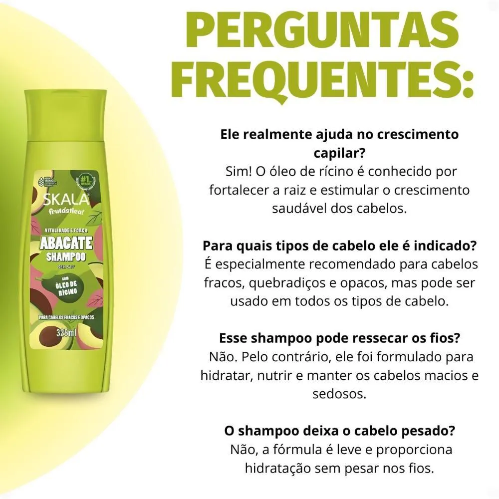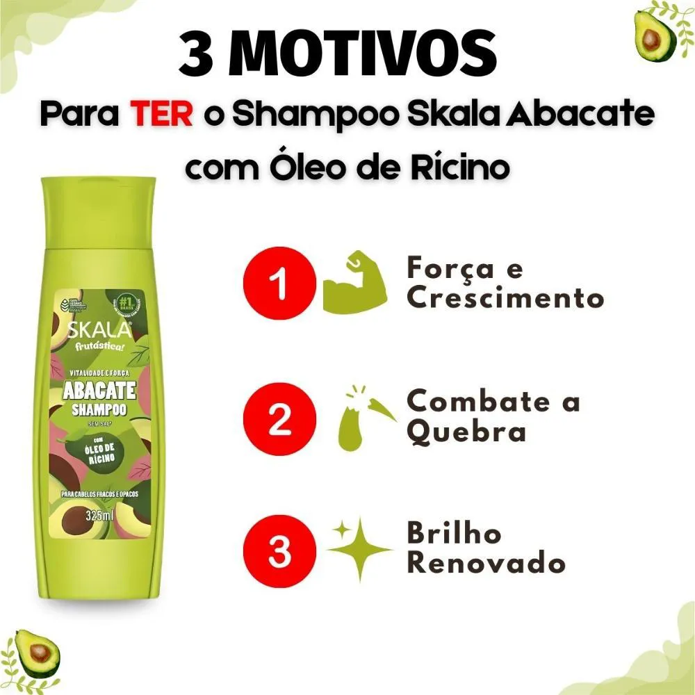 Descubra o poder nutritivo do Shampoo Skala Frutástica! Abacate Com Óleo De Rícino 325ml, a solução ideal para revitalizar cabelos fracos, quebradiços e opacos. Este shampoo foi cuidadosamente formulado para proporcionar uma limpeza eficaz enquanto nutre profundamente os fios, preparando-os para um crescimento saudável e uma aparência radiante. Com a combinação potente de extrato de abacate e óleo de rícino, ele atende às necessidades de quem busca força, hidratação e um cabelo livre de frizz.Benefícios Principais