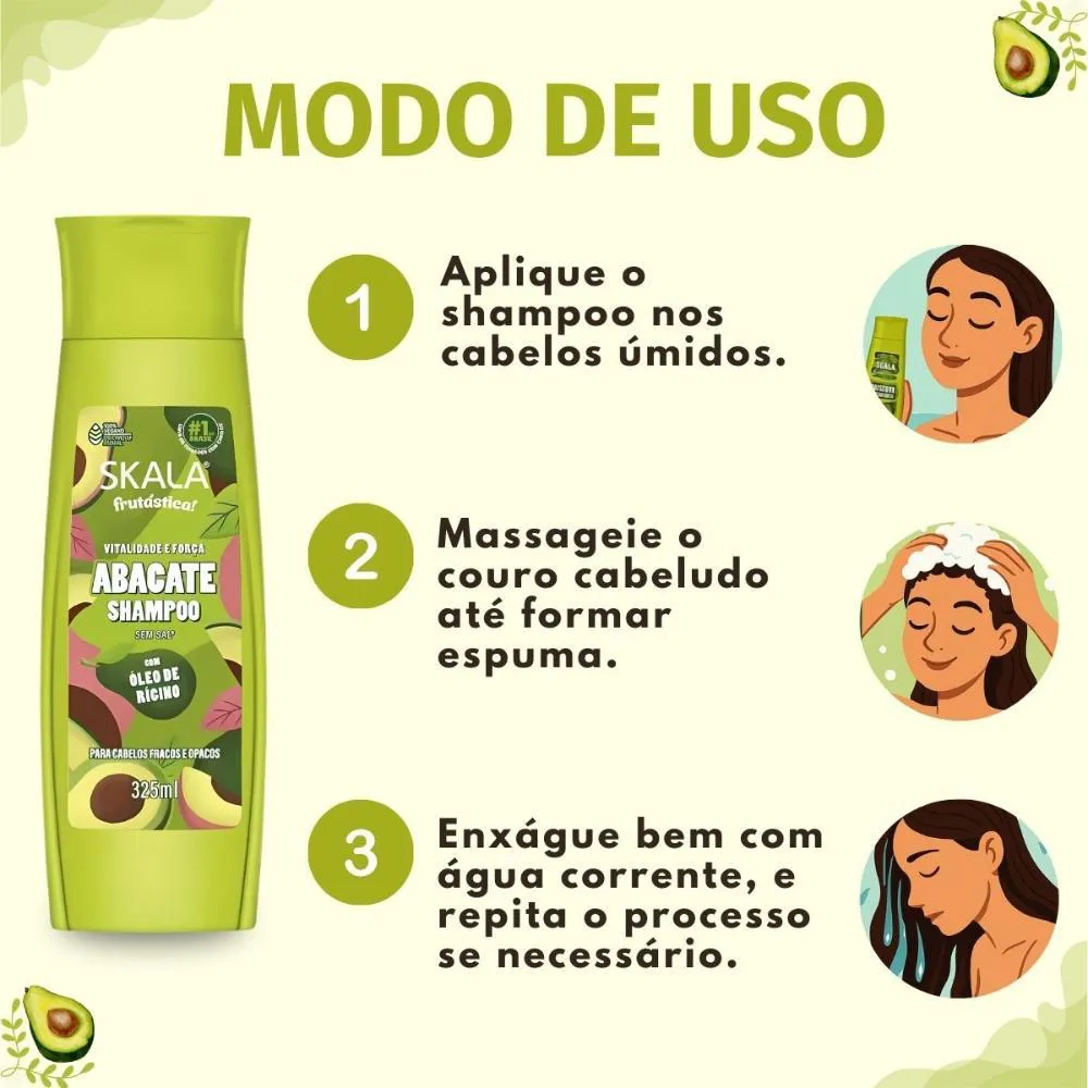 Aplique o Shampoo Skala Frutástica! Abacate Com Óleo De Rícino nos cabelos úmidos e massageie suavemente até obter uma espuma cremosa.Enxágue bem e repita a operação se necessário.Para melhores resultados, utilize a linha completa Skala Expert Abacate.Anvisa: 25351.103544/2025-30