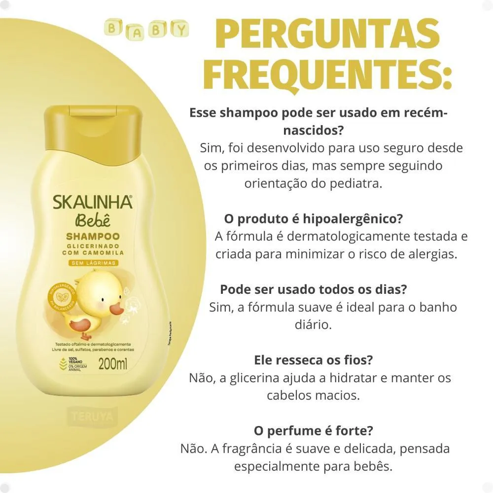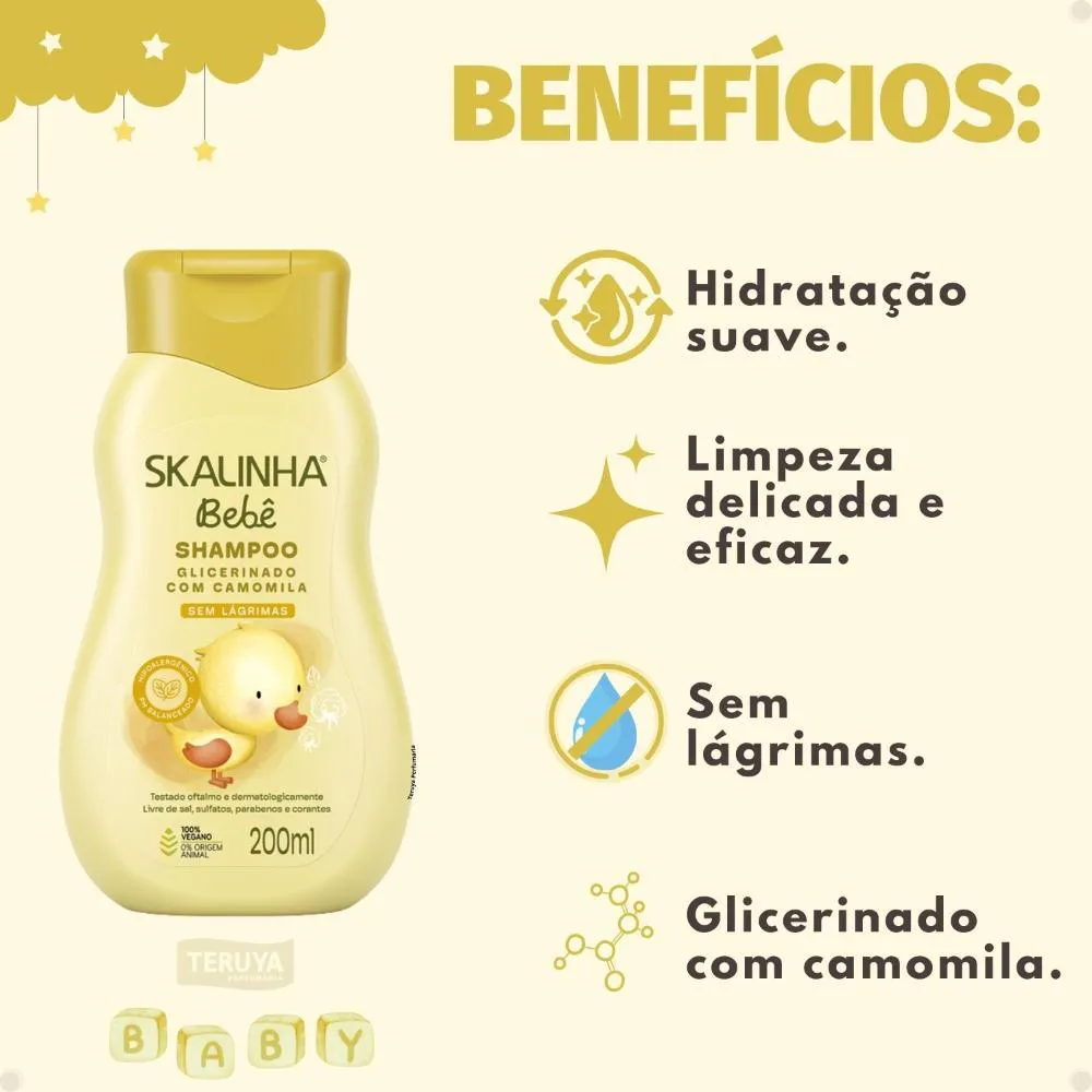 Desenvolvido especificamente para a pele e cabelo sensíveis do bebê. Combinação de glicerina e camomila para cuidado completo. Marca SKALA, reconhecida pela qualidade e cuidado.Ocasiões de Uso/Cenários Ideais