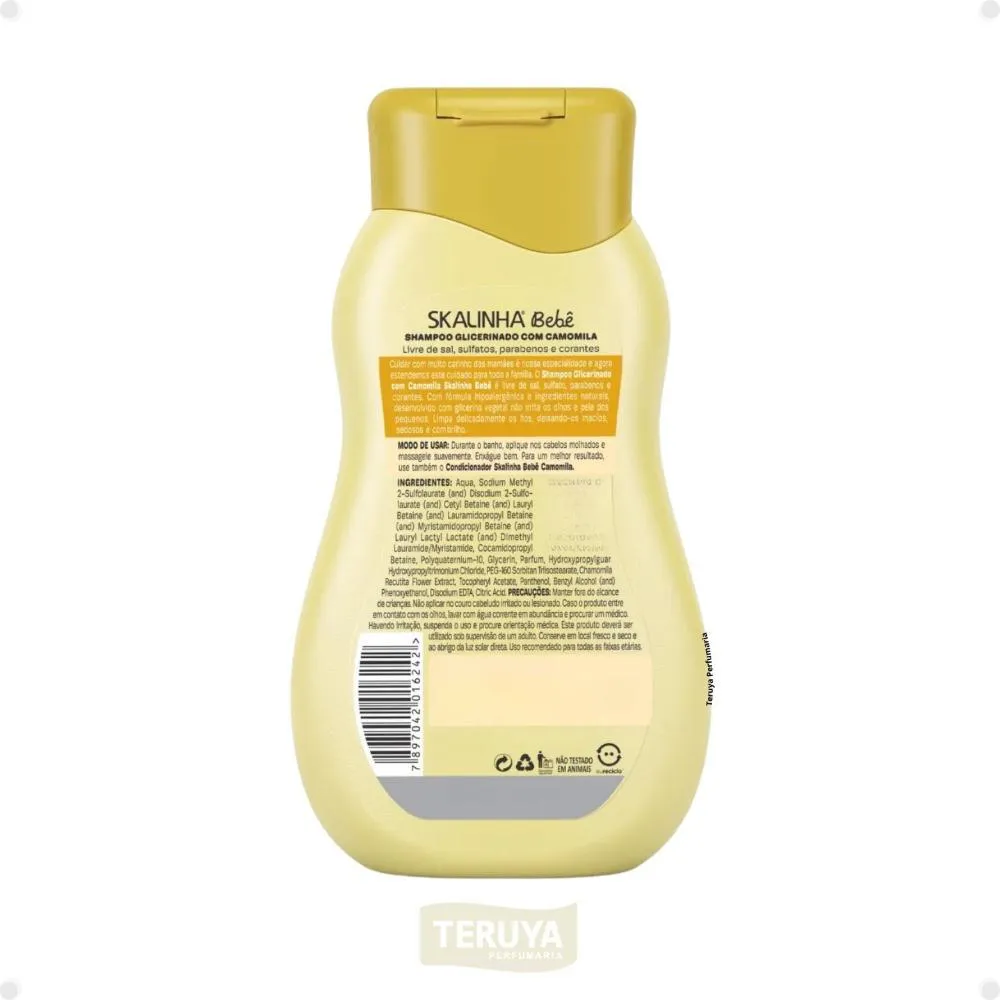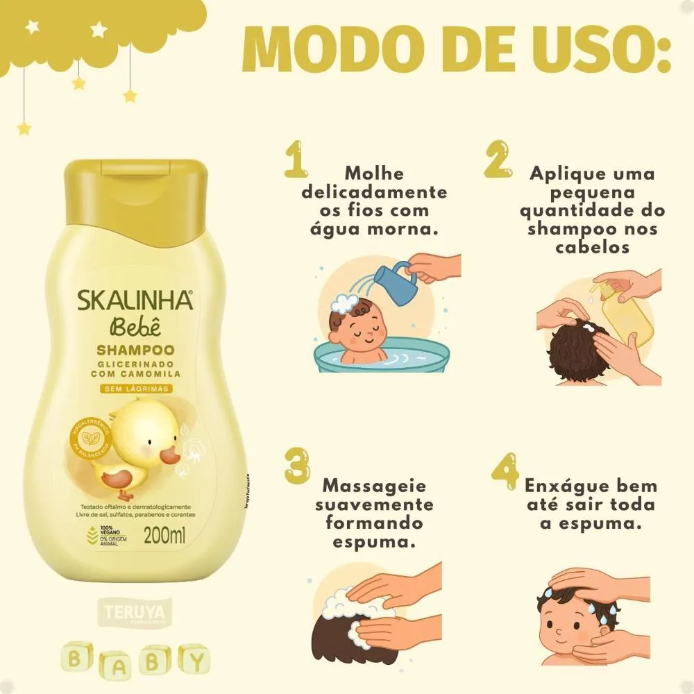 Aplique uma pequena quantidade do Shampoo Skalinha Bebê Glicerinado Com Camomila nas mãos e massageie suavemente o cabelo molhado do bebê até formar espuma. Enxágue abundantemente com água.Anvisa: 25351.309416/20222-55