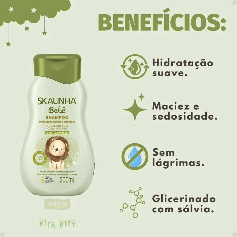 Desenvolvido especialmente para o cuidado delicado dos pequenos, o Shampoo Skalinha Bebê Glicerinado Com Sálvia da SKALA oferece uma limpeza suave e eficaz para cabelos crespos e cacheados. Sua fórmula exclusiva, enriquecida com Sálvia, é ideal para nutrir e definir os cachinhos, proporcionando maciez e brilho sem agredir o couro cabeludo sensível.Com 200ml, este shampoo é a escolha perfeita para pais que buscam um produto de qualidade que cuide dos fios dos seus bebês, mantendo-os saudáveis e bonitos desde os primeiros banhos.