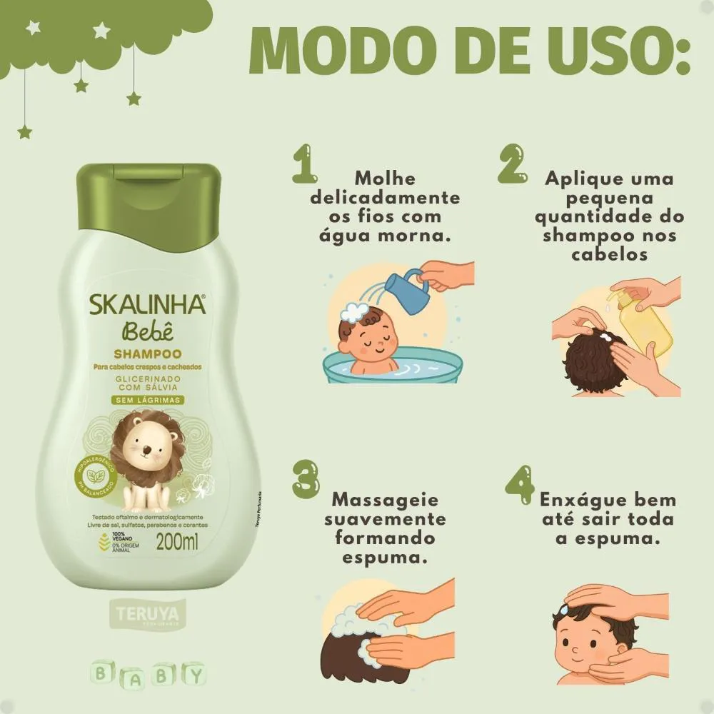 mãos.Massageie suavemente o couro cabeludo e os fios com as pontas dos dedos, em movimentos circulares, até formar espuma.Enxágue abundantemente com água morna até remover todo o produto, certificando-se de que não restem resíduos.Para melhores resultados, utilize a linha completa Skalinha Bebê, incluindo o