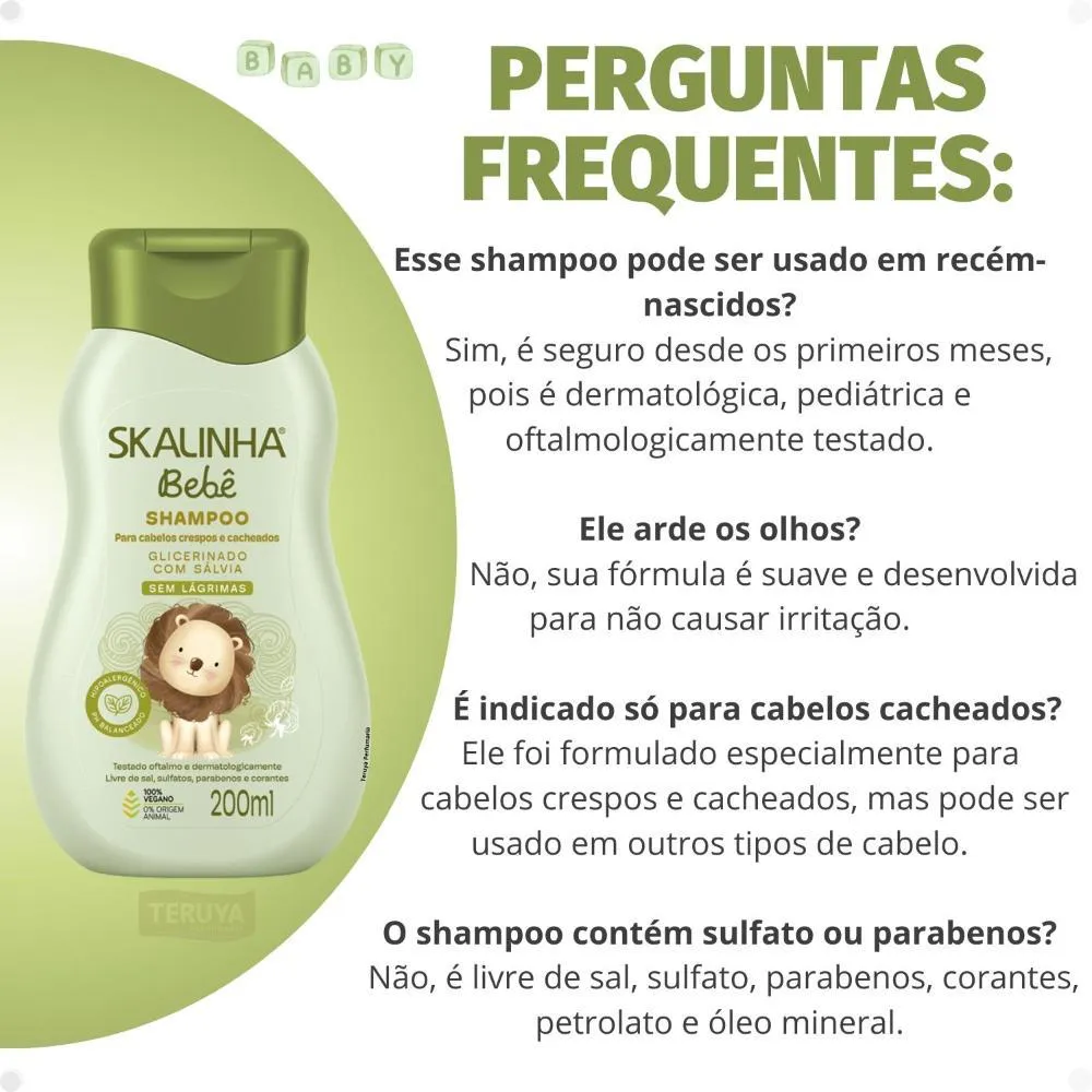 Fórmula glicerinada, conhecida por suas propriedades umectantes e hidratantes, que ajudam a reter a umidade natural dos fios.Enriquecido com extrato de Sálvia, um ingrediente natural que contribui para o fortalecimento e brilho dos cabelos.Desenvolvido especificamente para atender às necessidades de cabelos crespos e cacheados de bebês, com ingredientes suaves e seguros.Produto da linha Skalinha Bebê, da renomada marca SKALA, sinônimo de qualidade, cuidado e tradição em produtos infantis.