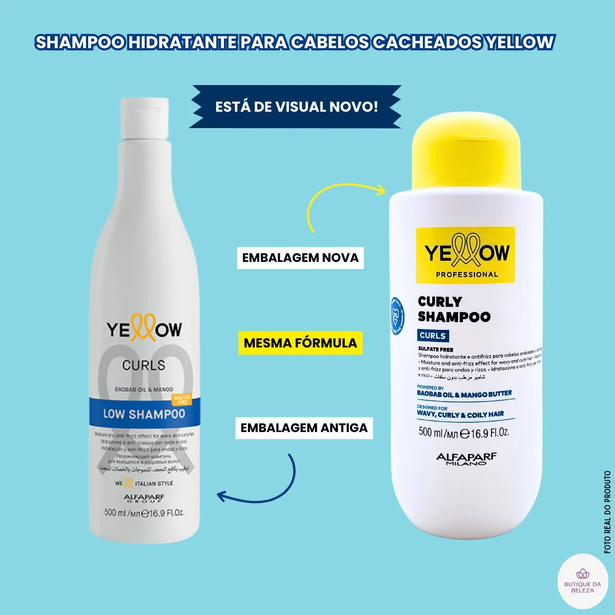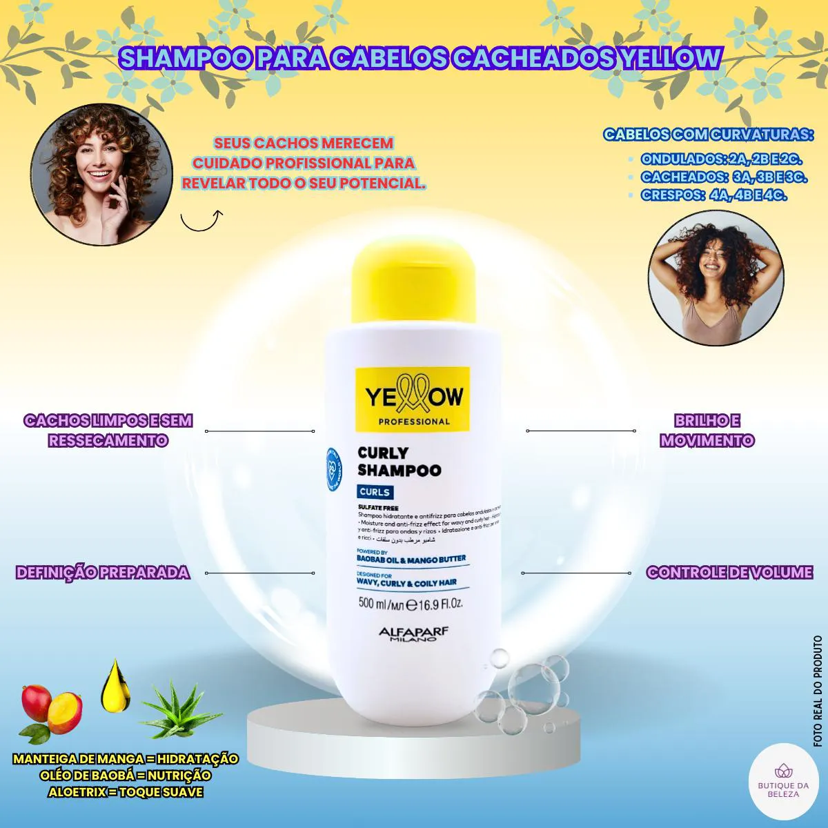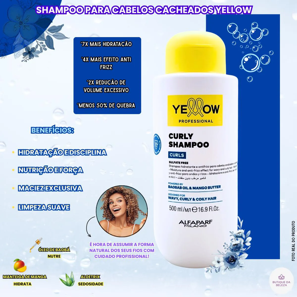 Somos a BUTIQUE DA beleza Uma empresa especializada no comércio de Cosméticos e Semijoias. Estamos sempre entre os Melhores Vendedores. NOSSO COMPROMISSO É COM VOCÊ! SEU CONFORTO E SEGURANÇA SÃO NOSSOS PROPÓSITOS SERVIR E AJUDAR SÃO NOSSOS DEVERES shampoo HIDRATANTE PARA CABELOS CACHEADOS YELLOW - 500ml Seus cachos ou ondas estão ressecados, indisciplinados e sofrendo com o excesso de frizz logo após a lavagem? É hora de assumir a forma natural dos seus fios com cuidado profissional! O Shampoo para cabelos sem definição Yellow, é o primeiro passo profissional para assumir a forma natural dos seus cabelos ondulados, cacheados e crespos. Sua fórmula exclusiva, enriquecida com Manteiga de Manga, Óleo de Baobá e Aloetrix, promove uma limpeza delicada que preserva a oleosidade essencial dos fios, garantindo nutrição e disciplina logo na lavagem. Transforme a saúde dos seus cachos com resultados comprovados que oferecem 7x mais hidratação e tornam os cachos muito mais elásticos. A tecnologia da linha garante 4x mais efeito antifrizz e 2x redução de volume excessivo, além de proteger a fibra capilar diminuindo em 50% a quebra causada pelo uso de ferramentas de calor. Quer cabelos limpos, protegidos e com movimento natural? Adquira o Shampoo Yellow para cabelos cacheados com frizz e tenha a limpeza nutritiva ideal para a sua curvatura.