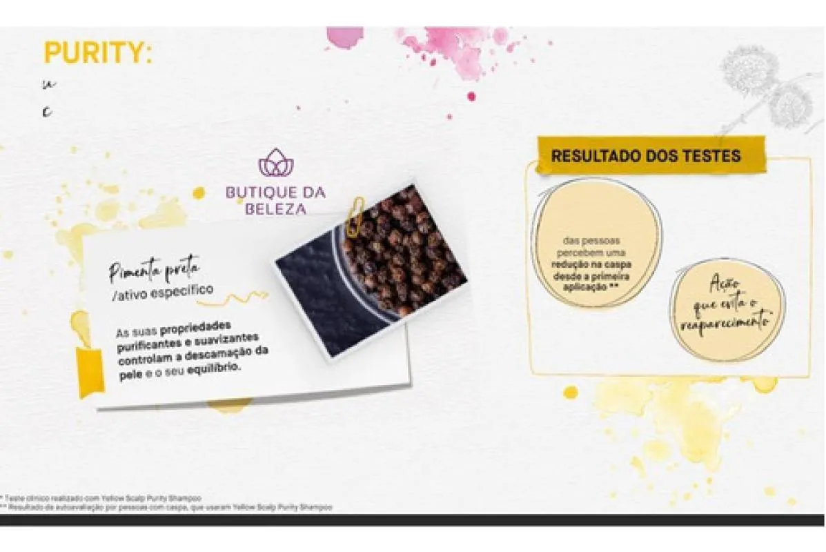 Somos a BUTIQUE DA beleza Uma empresa especializada no comércio de Cosméticos e Semijoias. Estamos sempre entre os Melhores Vendedores. NOSSO COMPROMISSO É COM VOCÊ! SEU CONFORTO E SEGURANÇA SÃO NOSSOS PROPÓSITOS SERVIR E AJUDAR SÃO NOSSOS DEVERES shampoo ANTICASPA YELLOW SCALP PURITY Shampoo Anticaspa Purificante que age no combate a caspa seca ou oleosa. Limpa profundamente normalizando o couro cabeludo e evita o reaparecimento da caspa. Confere alívio imediato ATIVO ESPECÍFICO DA LINHA Pimenta Preta - possui propriedades purificantes e suavizantes que agem no controle da descamação da pele, proporcionando equiíbrio alívio imediato da caspa. QUAL TIPO DE cabelo? Cabelos com caspa e coceira BENEFÍCIOS?! Redução da Caspa Alívio da Coceira