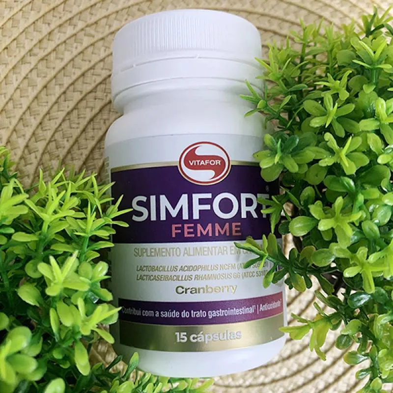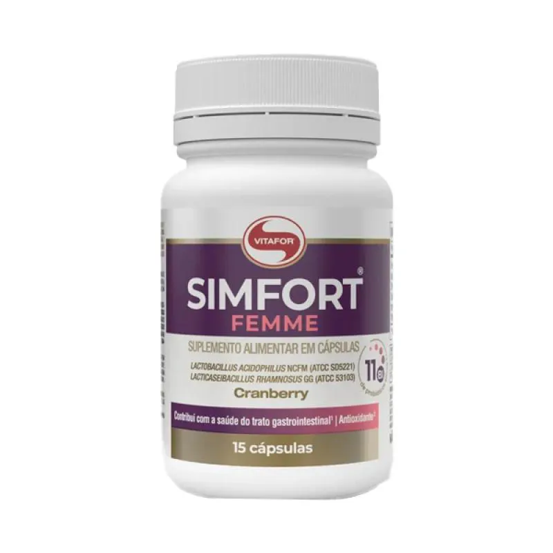 O Simfort Femme Probióticos, Cranberry e Zinco Vitafor leva 2 cepas de micro-organismos (Lacticaseibacillus rhamnosus GG (ATCC 53103) e Lactobacillus acidophilus NCFM (ATCC SD5221)), que contribuem para a saúde do trato gastrointestinal, o cranberry que auxilia na saúde geniturinária e o zinco que auxilia no funcionamento do sistema imune.
