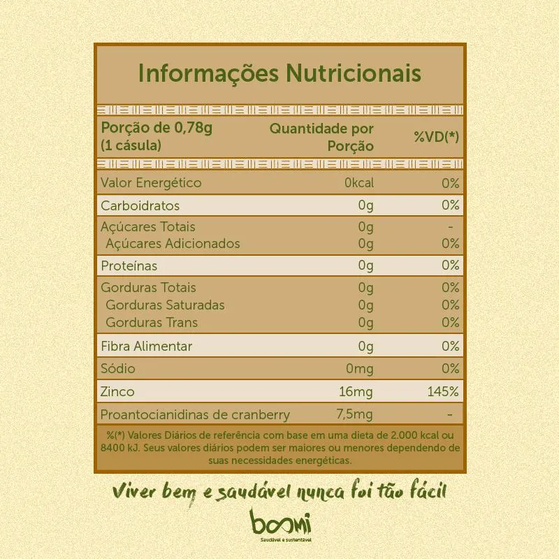 Ingredientes: Cranberry em pó (Vaccinium macrocarpon Aiton), bisglicinato de zinco (zinco), Lacticaseibacillus rhamnosus GG (ATCC 53103) e Lactobacillus acidophilus NCFM (ATCC SD5221), agente de massa celulose microcristalina, antiumectante dióxido de silício e lubrificante estearato de magnésio. Composição da cápsula: hidroxipropilmetilcelulose (HPMC), água purificada, opacificador (corante carbonato de cálcio e amido modificado), gelificante carragena e regulador de acidez acetato de potássio. NÃO CONTÉM GLÚTEN.