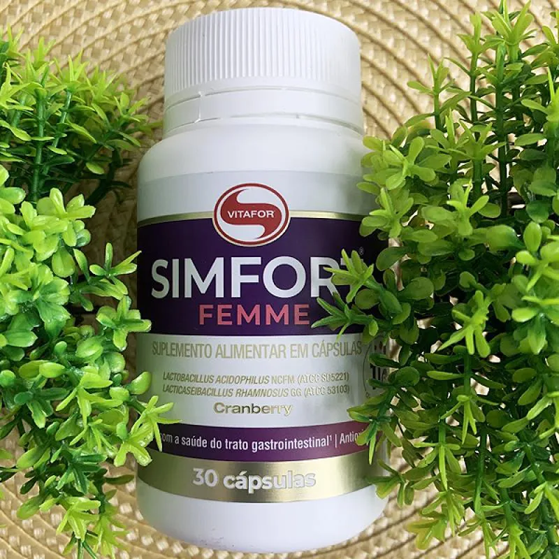 O Simfort Femme Probióticos, Cranberry e Zinco Vitafor 30 Cápsulas leva 2 cepas de micro-organismos (Lacticaseibacillus rhamnosus GG (ATCC 53103) e Lactobacillus acidophilus NCFM (ATCC SD5221)), que contribuem para a saúde do trato gastrointestinal, o cranberry que auxilia na saúde geniturinária e o zinco que auxilia no funcionamento do sistema imune.