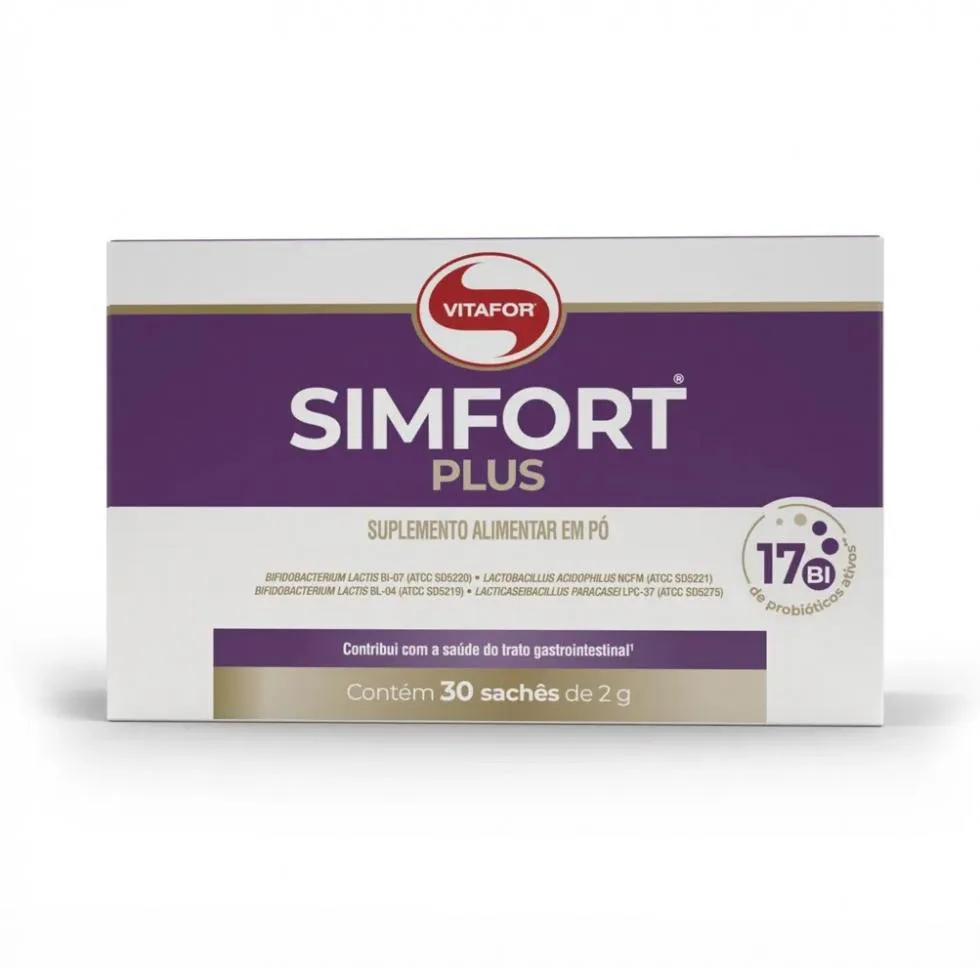 O Simfort Plus é um mix de probióticos composto por cinco cepas de micro-organismos vivos (Lactobacillus acidophillus, Lactobacillus casei, Lactococcus lactis, Bifidobacterium lactis e Bifidobacterium bifidum), apresentado em sachês de 2g. Seu objetivo principal é contribuir para uma microbiota intestinal saudável, estimulando a multiplicação de bactérias benéficas e reforçando os mecanismos naturais de defesa do organismo, com uma quantidade ideal de 5 bilhões de micro-organismos vivos por sachê.