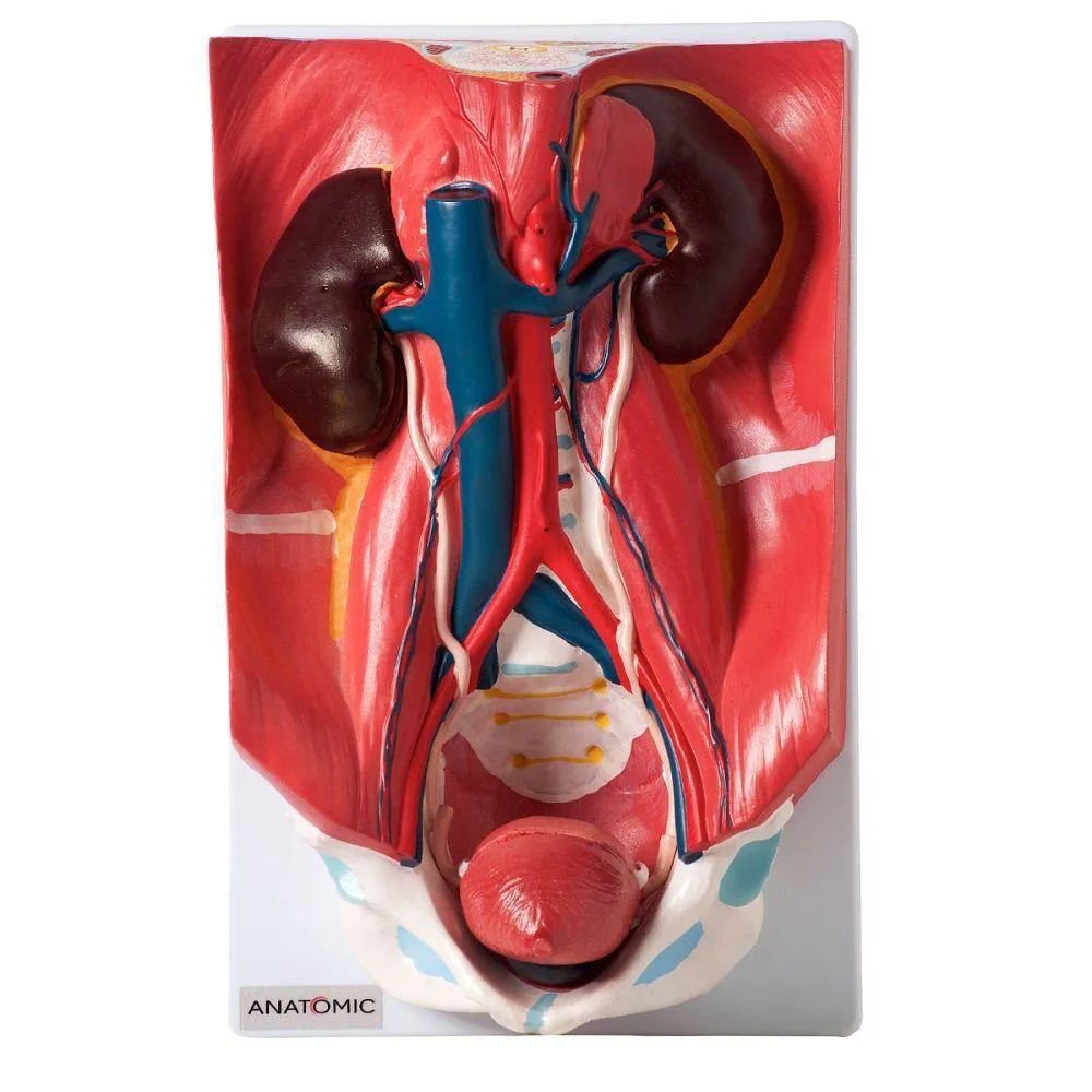 Modelo em 4 partes, exibe órgãos do sistema urinário, artérias e veias, musculatura interna do abdome e parte óssea da pélvica. Confeccionado em resina plástica, montado sobre prancha. Composto por: Glândulas suprarenais, Rins, Cápsula adiposa, Ureteres, Bexiga urinária, Próstata, Artérias e veias, Músculos internos do abdome, Reto, Ossos da pélvica. O modelo TGD-0328-A permite: Visualizar estrutura dos rins, cápsula adiposa, ureteres, artérias e veias renais, aorta abdominal, veia cava inferior, artérias e veias ilíacas comuns, artérias e veias testiculares, bexiga, próstata, reto.Visualizar parte óssea: sacro, acetábulo, ísquio, sínfise púbica e ramo do ísquio