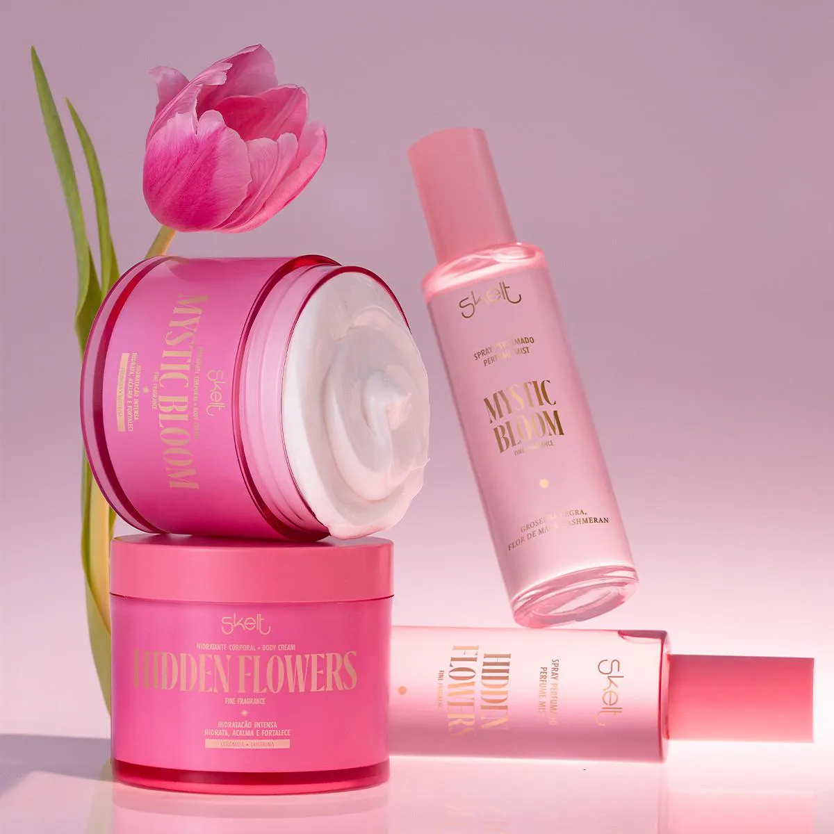 Skelt Mystic Bloom - Hidratação Profunda, Nutrição e Fragrância Envolvente Nutre profundamente, enquanto fortalece a barreira da pele. Com textura cremosa de rápida absorção, mantém a hidratação por horas, reduzindo a perda de água. Enriquecido com ceramidas e glicerina, acalma e protege todos os tipos de pele. Sua fragrância sofisticada mistura notas florais, cítricas e frutadas, com fundo adocicado e envolvente.