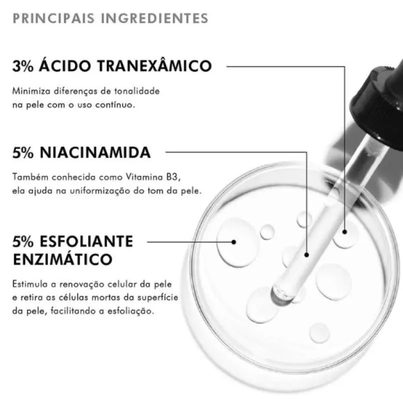 Discoloration Defense é um sérum multicorretivo de uso diário que clareia as diferenças de tonalidade da pele com resultados visíveis e comprovados em pele brasileira. Formulado com 3% de ácido tranex, 1% de ácido kójico, 5% de niacinamida e 5% de H.E.P.E.S, esse blend de ativos com alta performance uniformiza o tom, recupera a luminosidade e melhora a textura da pele.