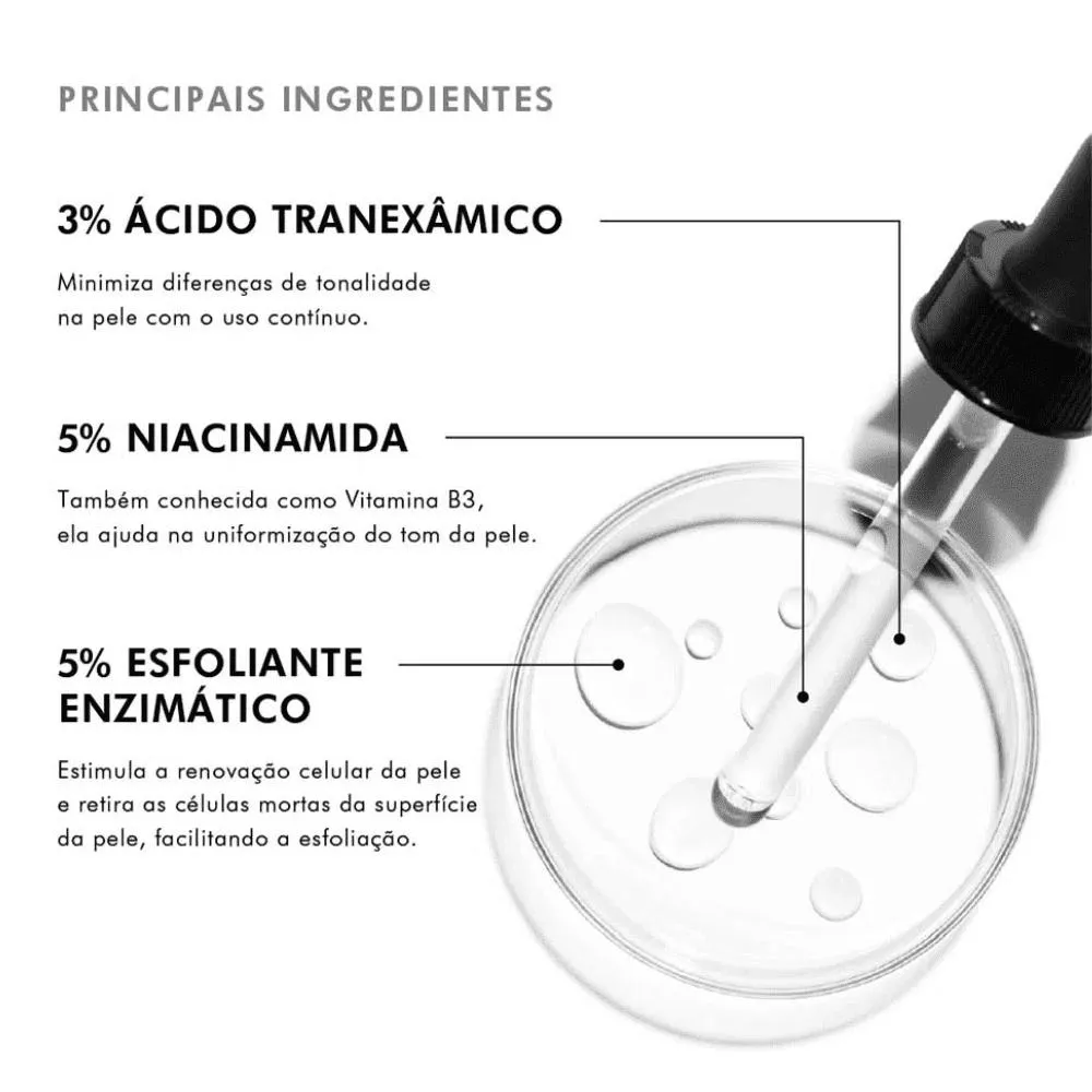 Ácido , Niacinamida, HEPES, Metilsilanol PCA, Glicirrizinato de Dipotássio, Extrato de Raiz de Morus Alba, e outros ingredientes ativos específicos para o tratamento de descolorações cutâneas.