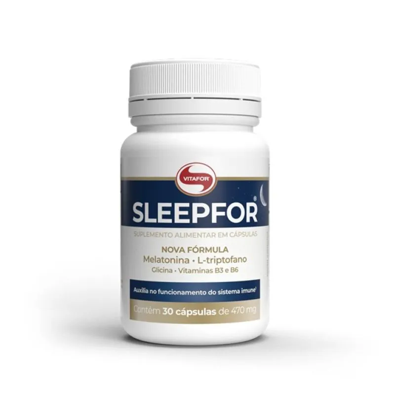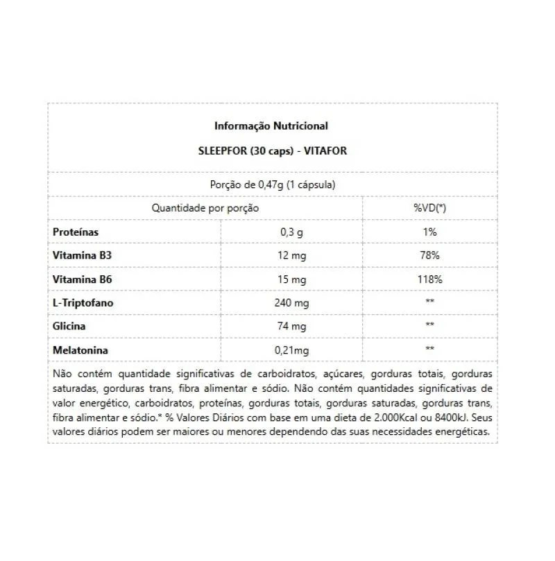 SLEEPFOR 470mg (30 caps) - VITAFOR Sleepfor da Vitafor é um suplemento alimentar à base de L-triptofano, Glicina, vitamina B3 e B6, com zero adição de açúcares. Sua fórmula combina ingredientes que auxiliam na melhora da qualidade do sono e relaxamento, além de favorecer a redução da ansiedade. Benefícios: * A niacina (vitamina B3) e a vitamina B6 auxiliam no metabolismo energético e no metabolismo de proteínas, carboidratos e gorduras;* A vitamina B6 auxilia no funcionamento do sistema imune e no metabolismo de proteínas, glicogênio e de homocisteína;* A niacina (vitamina B3) contribui para a manutenção da pele;* 240mg de L-Triptofano por porção;* Fonte de Vitamina B3 e B6;* 74mg de Glicina por porção;* Produto vegano. Embalagem disponível: pote contendo 30 cápsulas.
