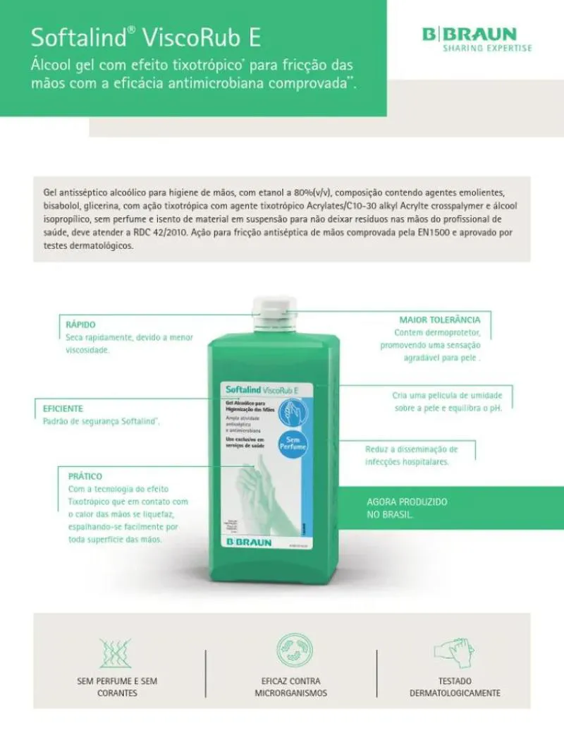 O Softalind Viscorub E 500 ml da B. Braun é um álcool gel antisséptico de alta performance para higiene das mãos, formulado com etanol, agentes emolientes, bisabolol e glicerina. Sua ação elimina 99,9% de bactérias e vírus, promove secagem rápida, não deixa resíduos e ajuda a proteger e hidratar a pele, mantendo o equilíbrio do pH. Ideal para uso hospitalar, clínico, laboratorial e corporativo, contribui para a prevenção de infecções por meio da antissepsia eficaz das mãos.