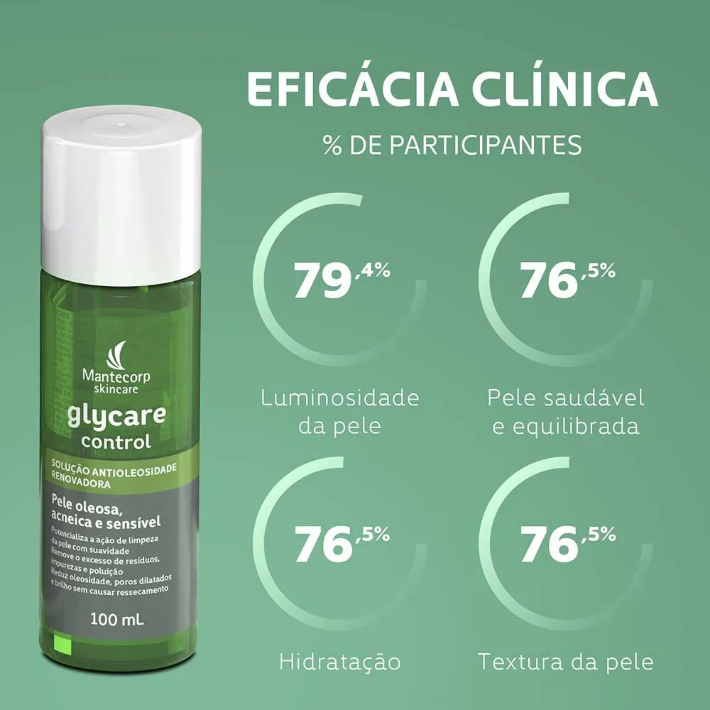 GLYCARE CONTROL SOLUÇÃO ANTIOLEOSIDADE mantém p pH fisiológico da pele, fortalecendo e proporcionando uma pele limpa, macia, saudável e equilibrada, com sensação de frescor e feito matte.