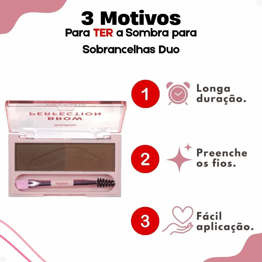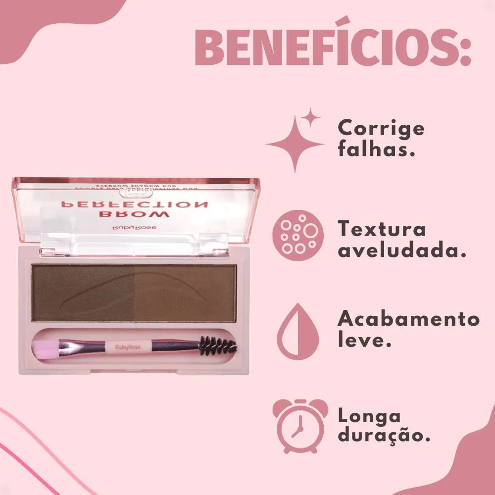 Descubra o segredo para sobrancelhas impecáveis com a Sombra para Sobrancelhas Duo Ruby Rose Brow Perfection Dou 04 HB-E2501-4. Este duo de sombras, desenvolvido pela renomada RUBY ROSE, é a chave para realçar seu olhar, preenchendo falhas e definindo o formato ideal das suas sobrancelhas. Com sua textura fina e longa duração, você conquista um visual natural e sofisticado em instantes, elevando sua