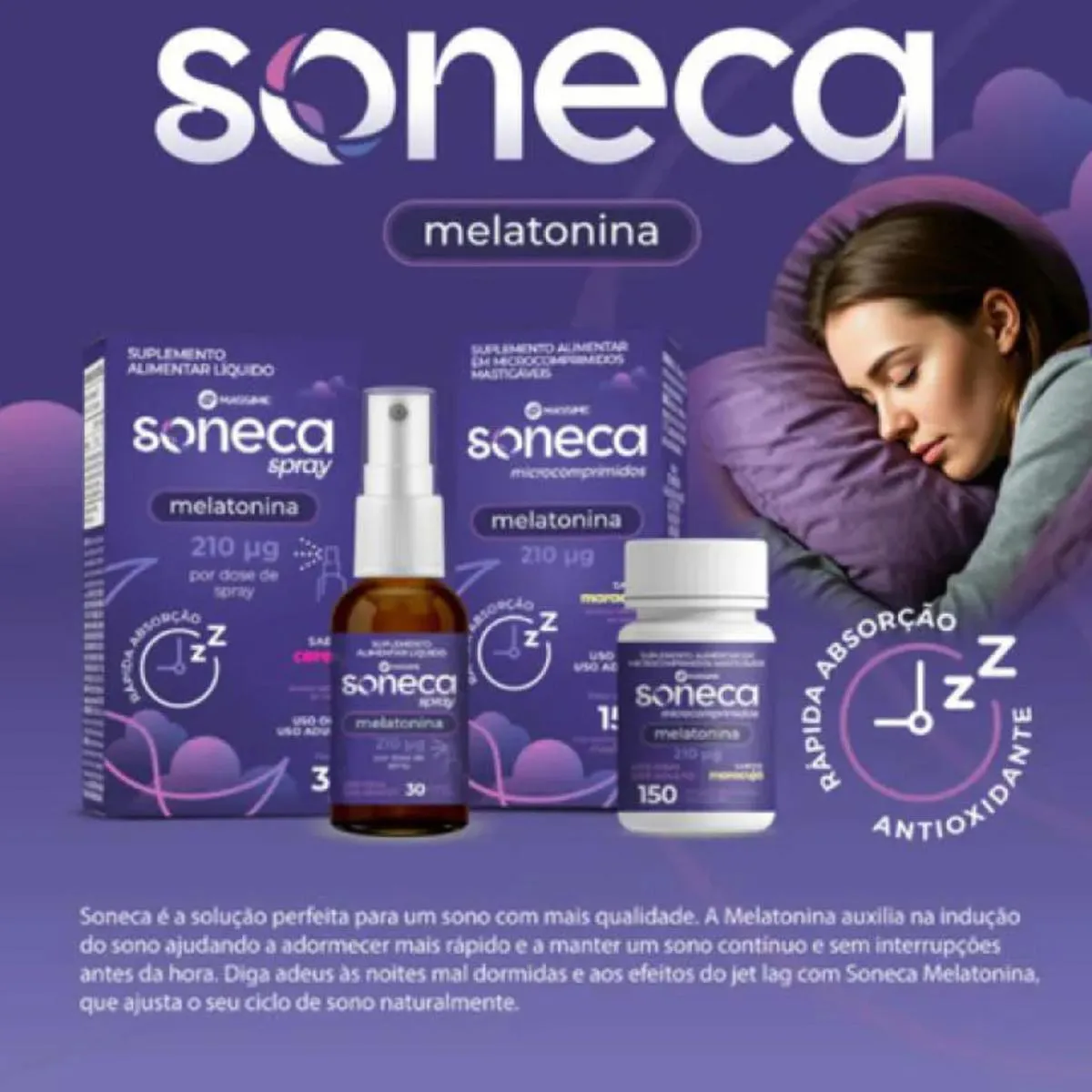 SONECA® Melatonina – Suplemento Alimentar em Gotas, Spray ou Microcomprimidos – Indução do sono A linha ONECA® oferece suplementos alimentares de melatonina em três apresentações: solução em gotas, spray e microcomprimidos.