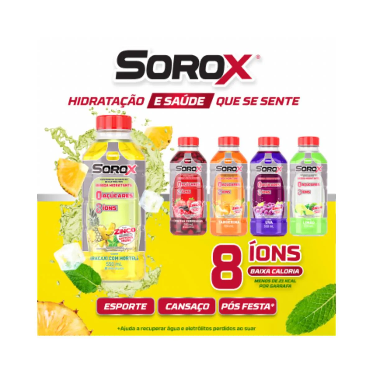 Sorox é uma bebida hidrotônica saborosa e refrescante, desenvolvida com uma fórmula exclusiva que combina água e 8 eletrólitos essenciais (magnésio, sódio, potássio, citrato, zinco, cálcio, cloreto e lactato). Essa composição foi pensada para promover hidratação superior e recuperação rápida dos sais minerais perdidos diariamente, seja em atividades físicas, em dias quentes ou em situações de desgaste físico.