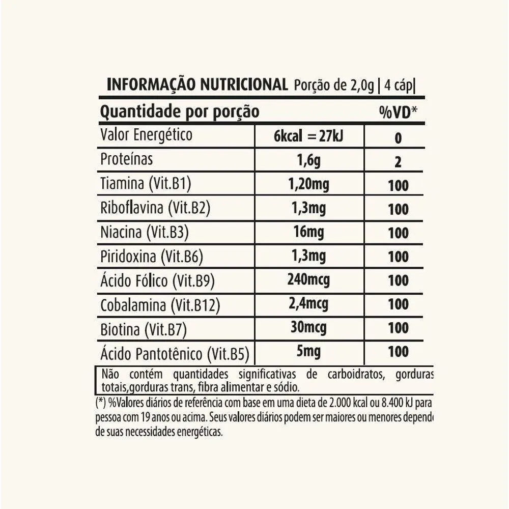 Informação Nutricional Spirulina - 500mg (120 caps) - ApisnutriPorção de 2,0g (4 cápsulas)Quantidade por porção%VD(*)Valor calórico3kcal=13kJ0%*Proteinas0,8g2%*Tiamina (Vit B1)1,20mg100%Riboflavina (Vit B2)1,3mg100%Niacina (Vit B3)16mg100%Pirodoxina (Vit B6)1,3mg100%Ácido Fólico (Vit B9)240mcg100%Cobalamina (Vit B12)2,4mcg100%Biotina (Vit B7)30mcg100%Àcido Pantotênico (Vit B5)5mg100%* % Valores Diários com base em uma dieta de 2.000Kcal ou 8400kJ. Seus valores diários podem ser maiores ou menores dependendo das suas necessidades energéticas. Obs: Pode haver pequenas variações na informação nutricional, de acordo com o sabor.