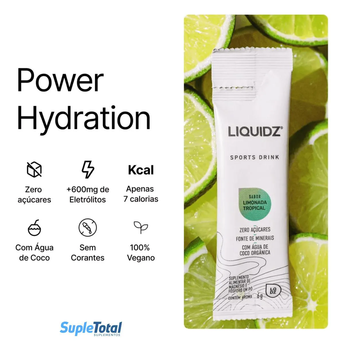 - Hidratação rápida com eletrólitos essenciais.