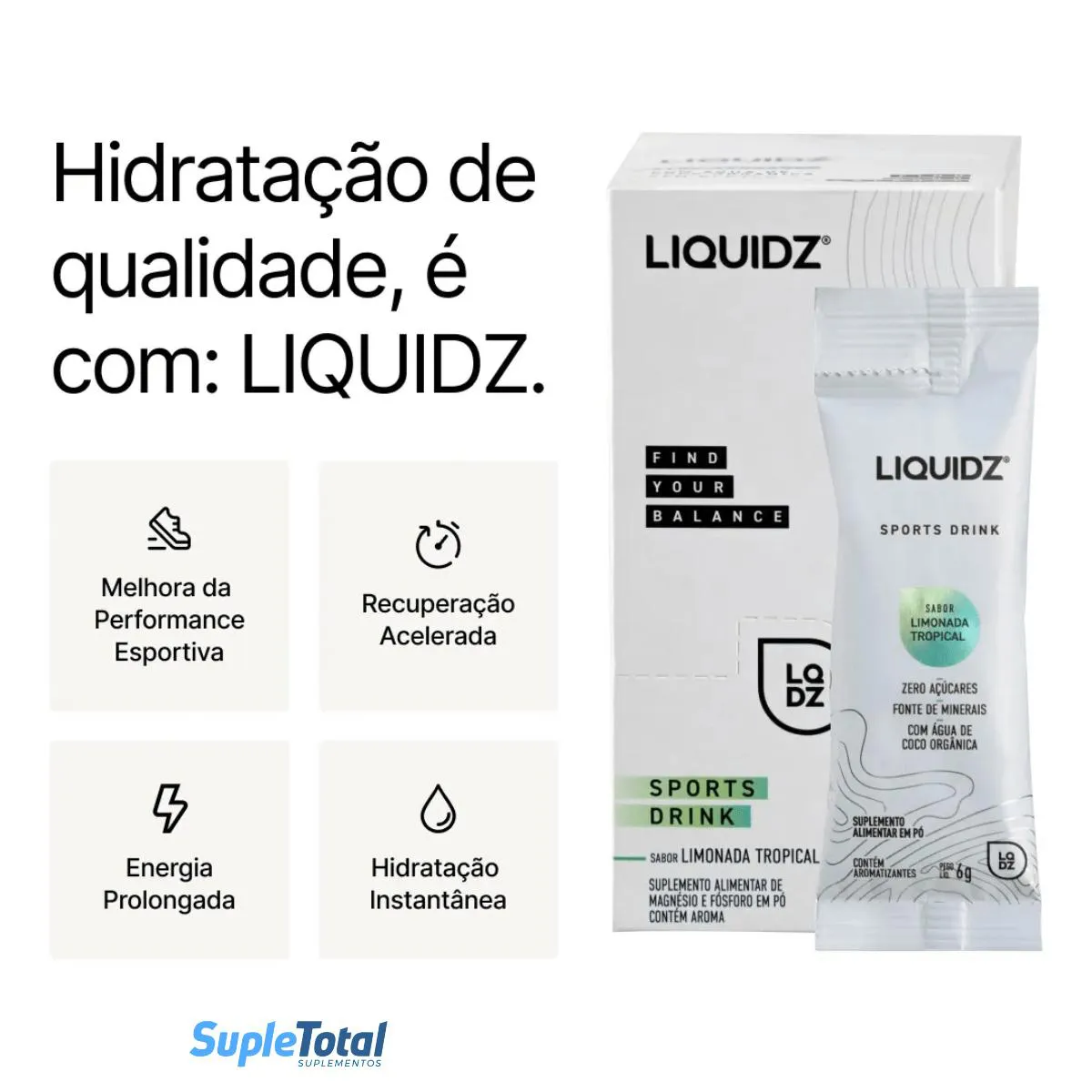 LIQUIDZ é uma solução de hidratação que combina os principais eletrólitos essenciais como sódio, potássio e magnésio. Esses minerais são fundamentais para manter a hidratação adequada, melhorar a função muscular e nervosa, e equilibrar o pH do corpo. LIQUIDZ é formulado para ser consumido diariamente, especialmente ao acordar, durante e após atividades físicas, para garantir uma hidratação eficiente e rápida.