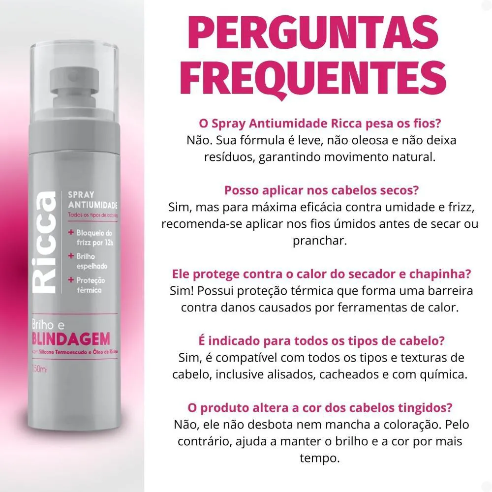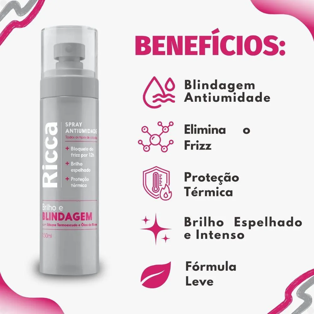 O Spray Antiumidade Ricca Brilho e Blindagem 150ml é um produto capilar leave-in desenvolvido para proteção e finalização dos cabelos. Formulado com Silicone Termoescudo e Óleo de Rícino, o spray oferece blindagem contra umidade e proteção térmica para todos os tipos de cabelo.
