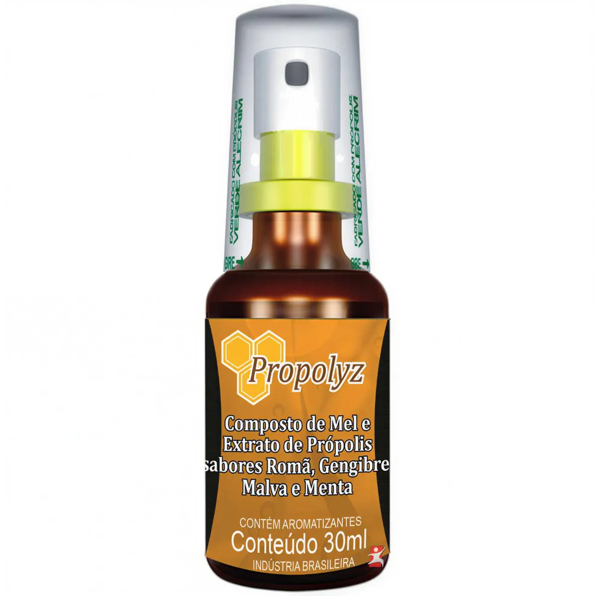 SPRAY LARANJA - MEL E PRÓPOLIS COM ROMÃ, GENGIBRE, MALVA E HORTELÃ 30ML - PROPOLYZ Todos os sprays da Propolyz são elaborados com Própolis Verde Alecrim. A própolis Verde Alecrim é produzida na região do Centro Oeste de Minas Gerais, nos apiários da empresa Natucentro e coletada nas colmeias por apicultores especializados. É conhecida internacionalmente como própolis verde. Green própolis, a qual tem como principal fonte vegetal a planta (Baccharis Dracunculifolia), alecrim do campo ou popular vassourinha, possuindo uma coloração verde.É considerada a melhor própolis do mundo, sendo amplamente consumida no Japão. Própolis é uma substância resinosa obtida pelas abelhas através da coleta de resinas da floras (pasto apícola) da região, e alteradas pela ação das enzimas contidas em sua saliva. A cor, sabor e o aroma da própolis variam de acordo com a origem botânica. As abelhas produzem o própolis em defesa da colméia, elas recobrem a entrada a fim de protegê-las contra fungos e bactérias. NÃO CONTÉM GLÚTEN