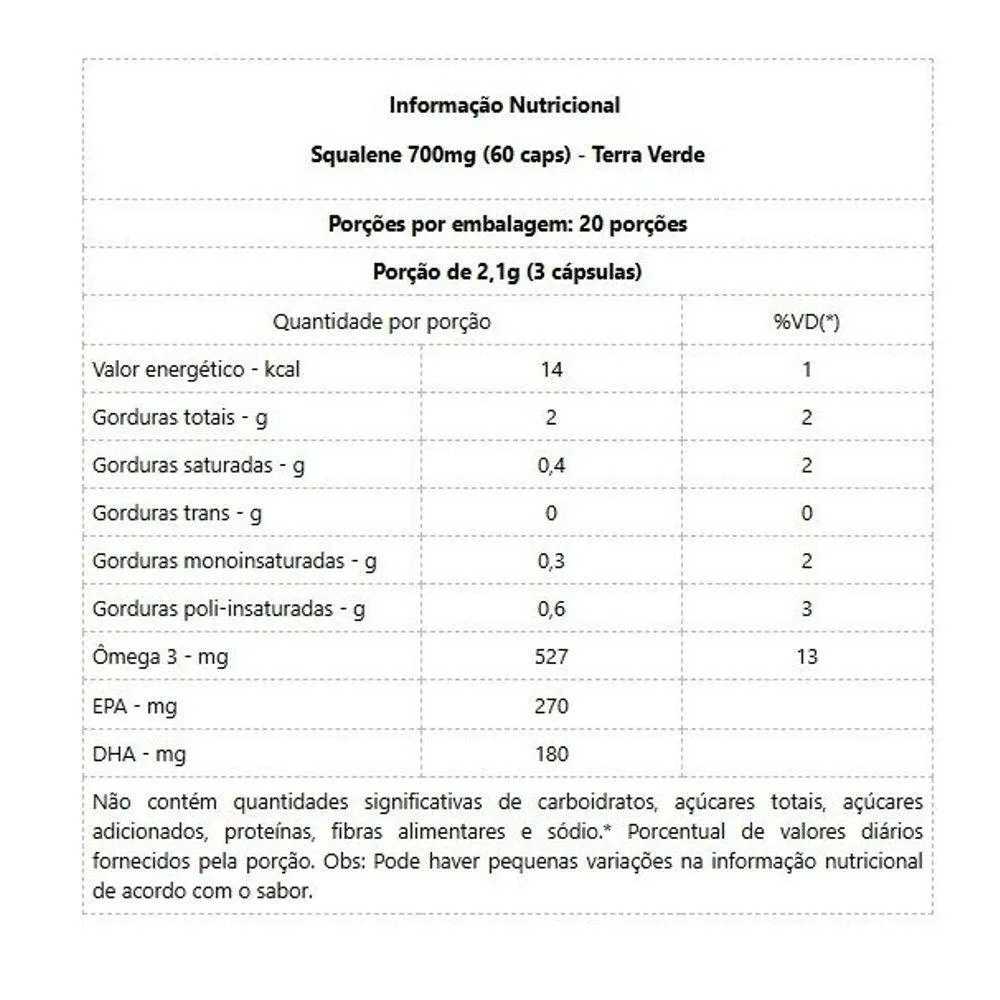Squalene 700mg (60 caps) Squalene Terra Verde em cápsulas, é formulado com base em um composto orgânico de alta qualidade, obtido a partir do tecido lipídico de peixes que habitam águas frias. Este suplemento é caracterizado pela pureza de 99% de ácidos graxos, incluindo poli-insaturados de cadeia longa, pertencentes às séries eicosapentaenóico (EPA) e docosahexaenóico (DHA). Estes ácidos graxos são amplamente recomendados para suplementação dietética devido aos seus múltiplos benefícios à saúde. Benefícios: - Fonte de ômega 3;- 500mg de Óleo de Peixe por cápsula;- Cápsula em softel fácil de ingerir;- Poder antioxidante.