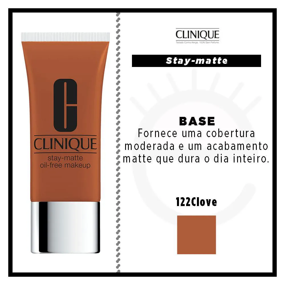O Stay-Matte Oil-Free Makeup é uma base da Clinique que reduz o brilho causado pela oleosidade excessiva. Sua fórmula oil-free foi desenvolvida para suportar climas quentes e com grande umidade.
