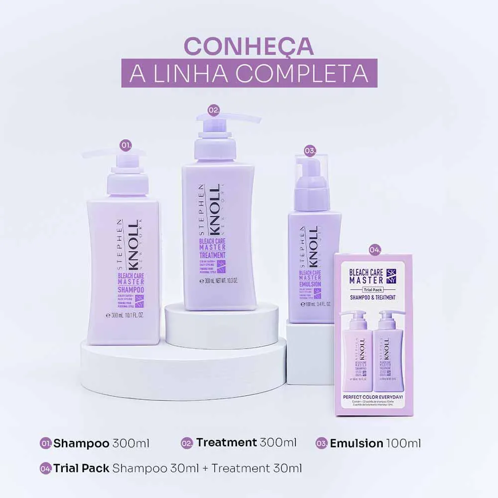Stephen Knoll Bleach Care Master Emulsion com poder de reparação combinado com a máxima proteção antidesbotamento da linha Bleach Care Master Stephen Knoll, especialmente formulada para cuidar dos cabelos descoloridos, ultra processados, danificados e porosos. Com foco em cuidados diários, oferece o tratamento ideal para prolongar a cor e revitalizar seus fios, garantindo maciez, sedosidade e facilidade ao pentear.