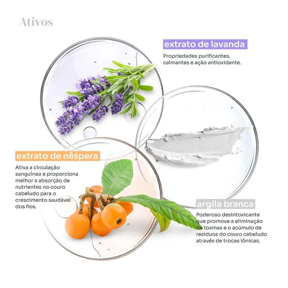 Argila Branca - poderoso desintoxicante que promove a eliminação de toxinas e o acúmulo de resíduos do couro cabeludo.