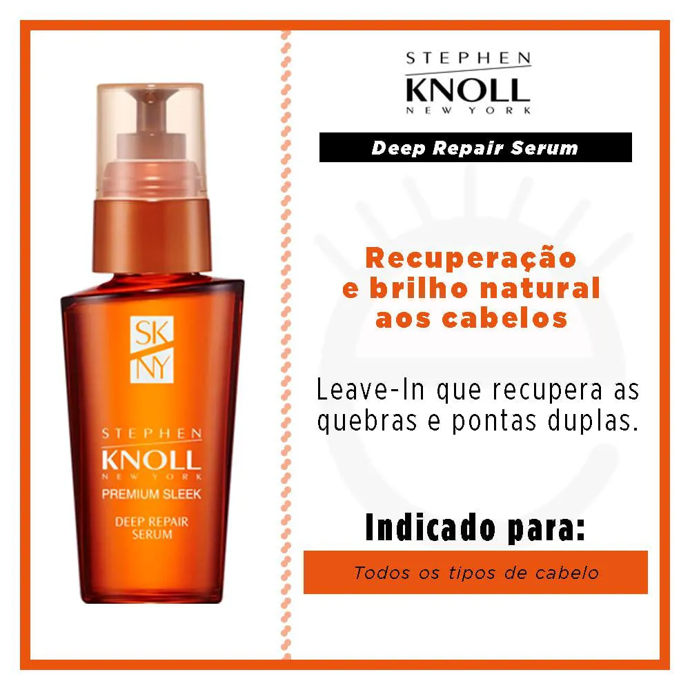 O Deep Repair Sérum de Stephen Knoll é um leave-in formulado com um complexo de reparação intensa capaz de penetrar profundamente nos fios para recuperá-los de quebras, pontas ressecadas, duplas e espigadas sem deixá-los com aspecto oleoso. Sua composição inclui agentes especiais para criar uma película protetora ao redor da fibra capilar, protegendo o cabelo das agressões diárias que prejudicam a saúde dos fios e proporcionando a hidratação ideal para mantê-lo sempre maleável, suave e sem frizz.