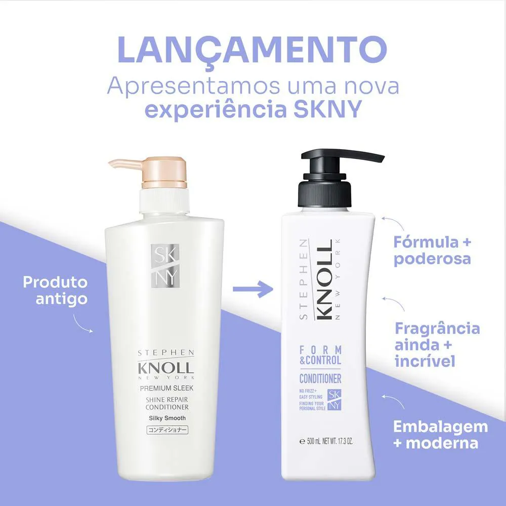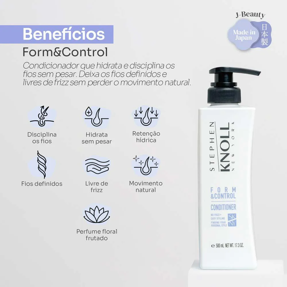 Formulado com tecnologia japonesa nos laboratórios da Kosé, o condicionador Form & Control Stephen Knoll hidrata e disciplina os fios sem pesar. Deixa os fios definidos e livres de frizz, sem perder o movimento natural.