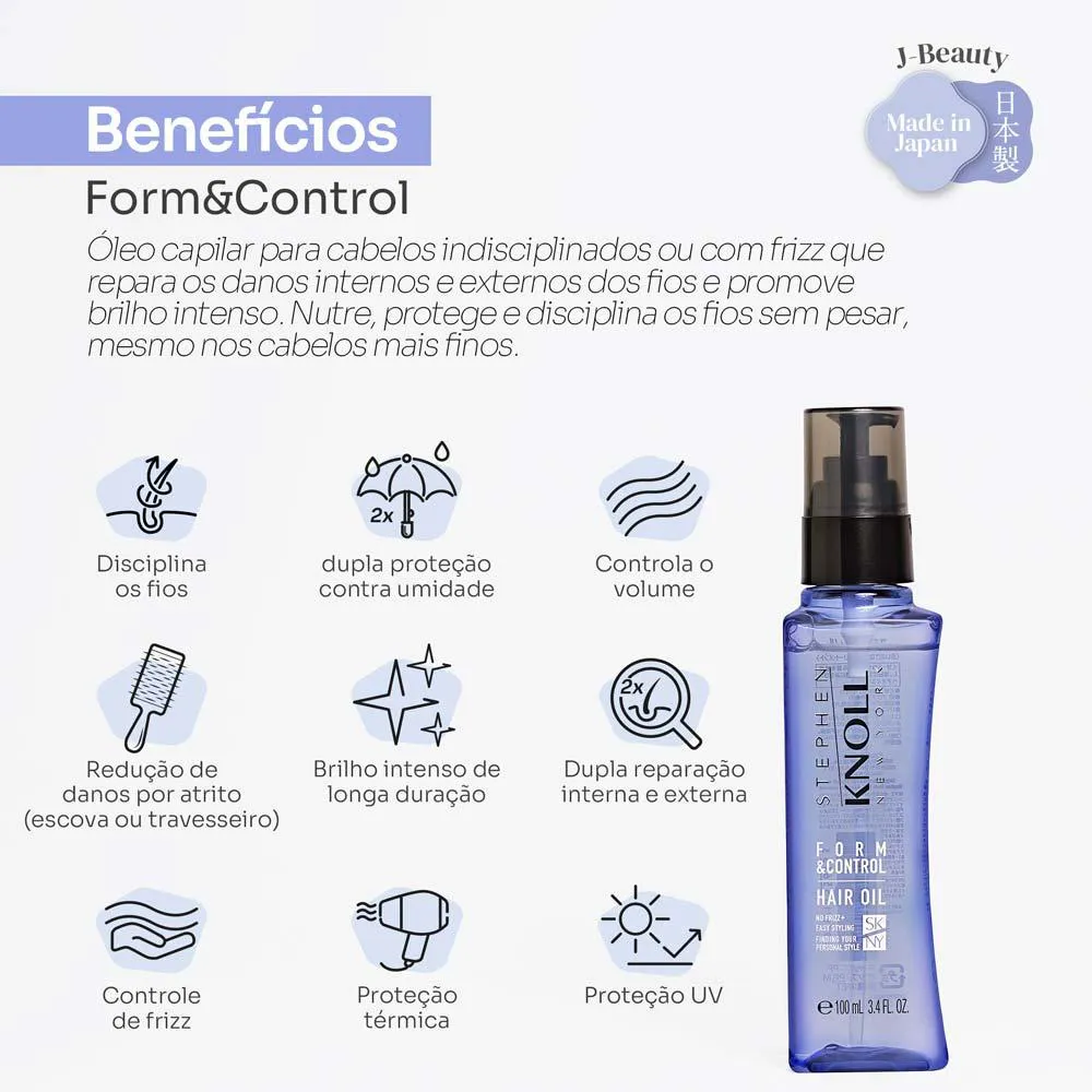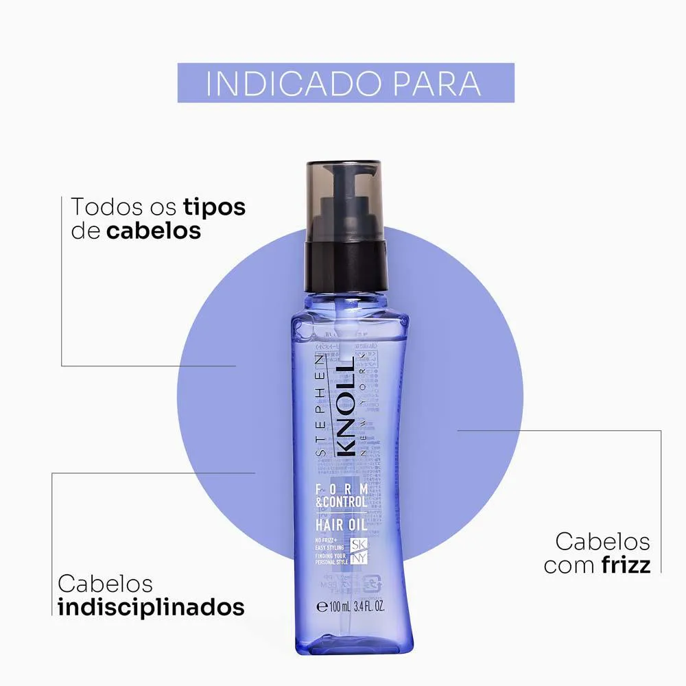 O novo Form & Control Hair Oil Stephen Knoll é o segredo para cabelos disciplinados e livres de frizz! Formulado especialmente para cabelos indisciplinados ou fios mais finos e delicados, este óleo capilar é a solução completa para reparar danos, proteger contra agressões externas, prolongar o alinhamento dos fios sem comprometer a leveza e promover brilho intenso.