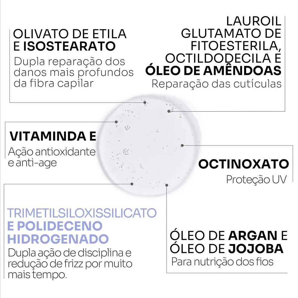 - Lauroil glutamato de fitoesterila, Octildodecila e Óleo de amêndoas sinergia de ativos de fácil espalhabilidade que aderem e revestem cada fio, promovendo reparação da cutícula.