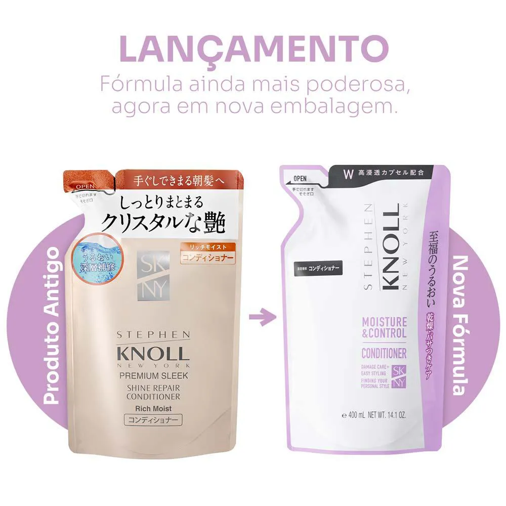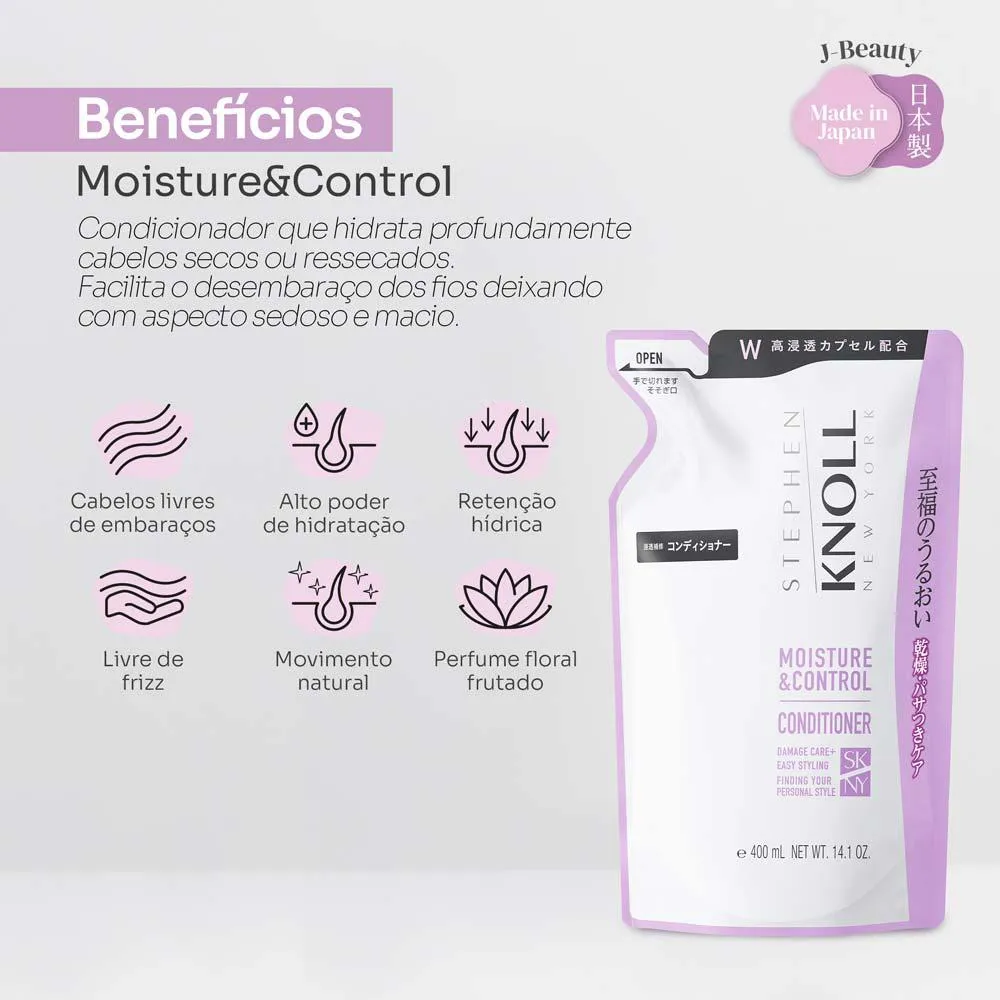 O condicionador Moisture & Control Stephen Knoll, desenvolvido nos laboratórios da Kosé com tecnologia japonesa, hidrata profundamente cabelos secos ou ressecados, facilita o desembaraço dos fios deixando com aspecto sedoso e macio.