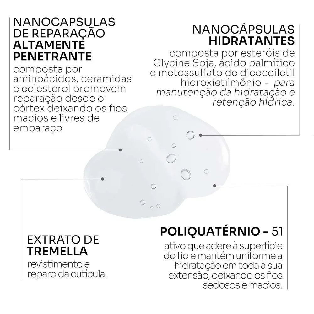 Perfeito para quem lava os cabelos a cada dois dias ou uma vez por semana. Os resultados são visíveis desde a primeira aplicação graças a formulação com nanocápsulas de multicamadas que penetram profundamente para distribuir os ativos, reparando a estrutura interna e externa dos fios.