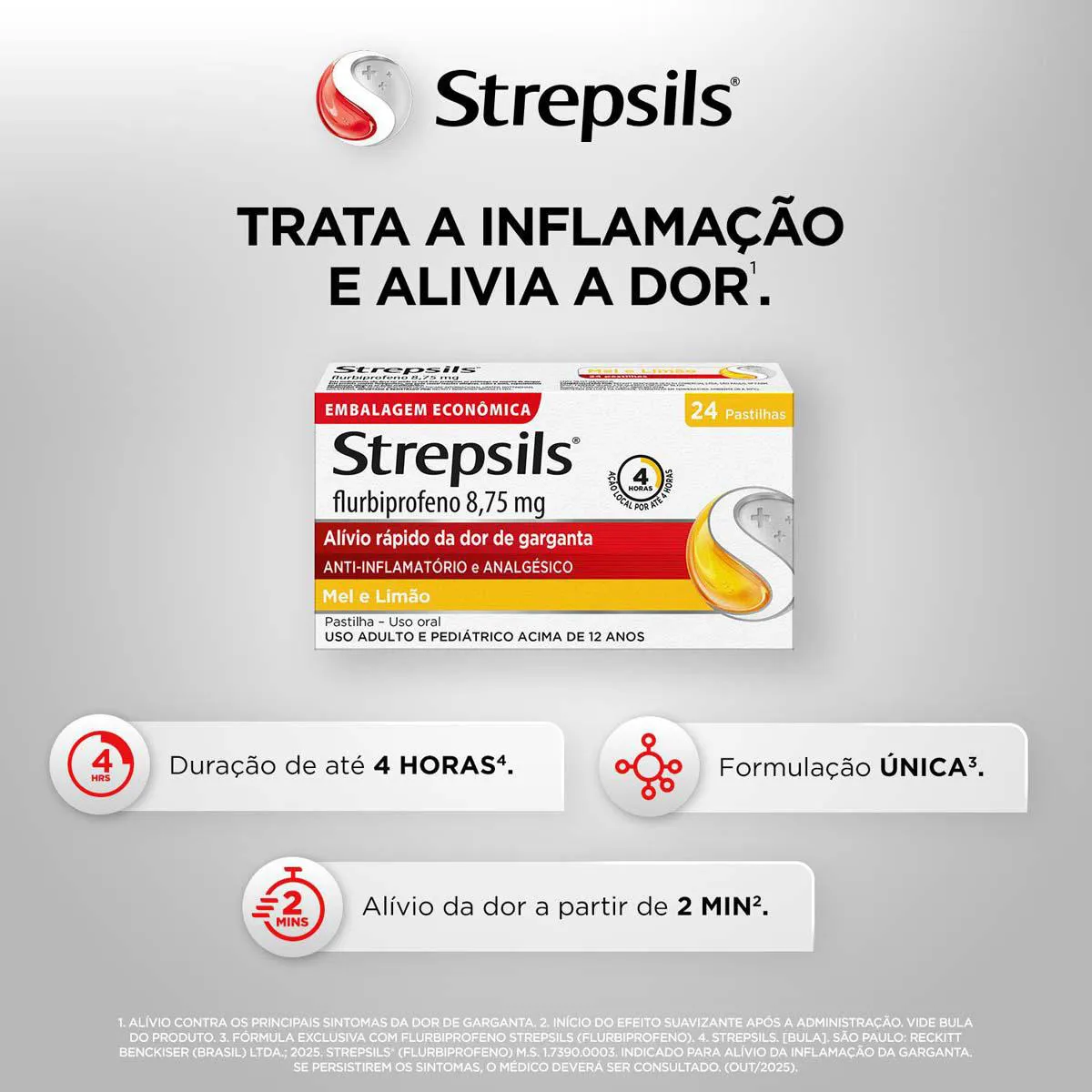 - ¹STREPSILS® (flurbiprofeno) M.S. 1.7390.0003. Indicado para alívio da inflamação da garganta. SE PERSISTIREM OS SINTOMAS, O MÉDICO DEVERÁ SER CONSULTADO (SET/2024).